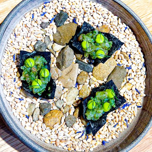 Michelin starred restaurant serves hors d’oeuvres in a bonsai pot full of rocks and barley husk