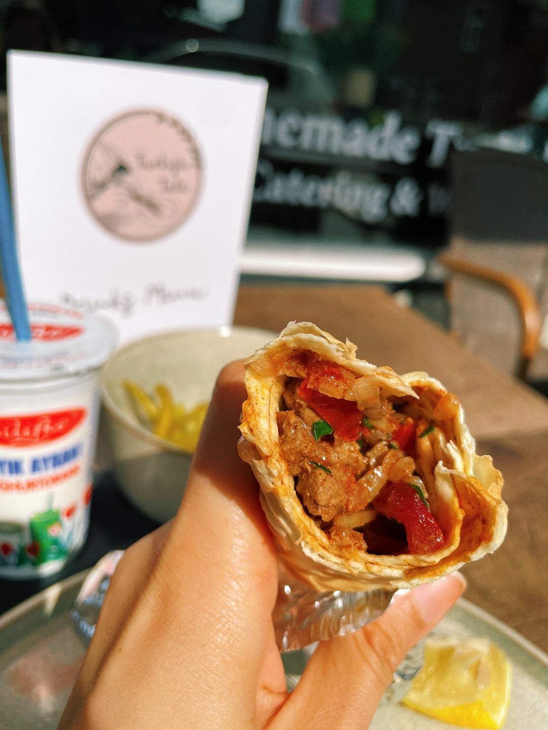 turkish street food: tantuni. small pieces of beef, spices, tomatoes, onion, parsley (originally) stir-fried with cotton oil. you have to squeeze some lemon juice on it! ayran (yoghurt drink) on the side of course