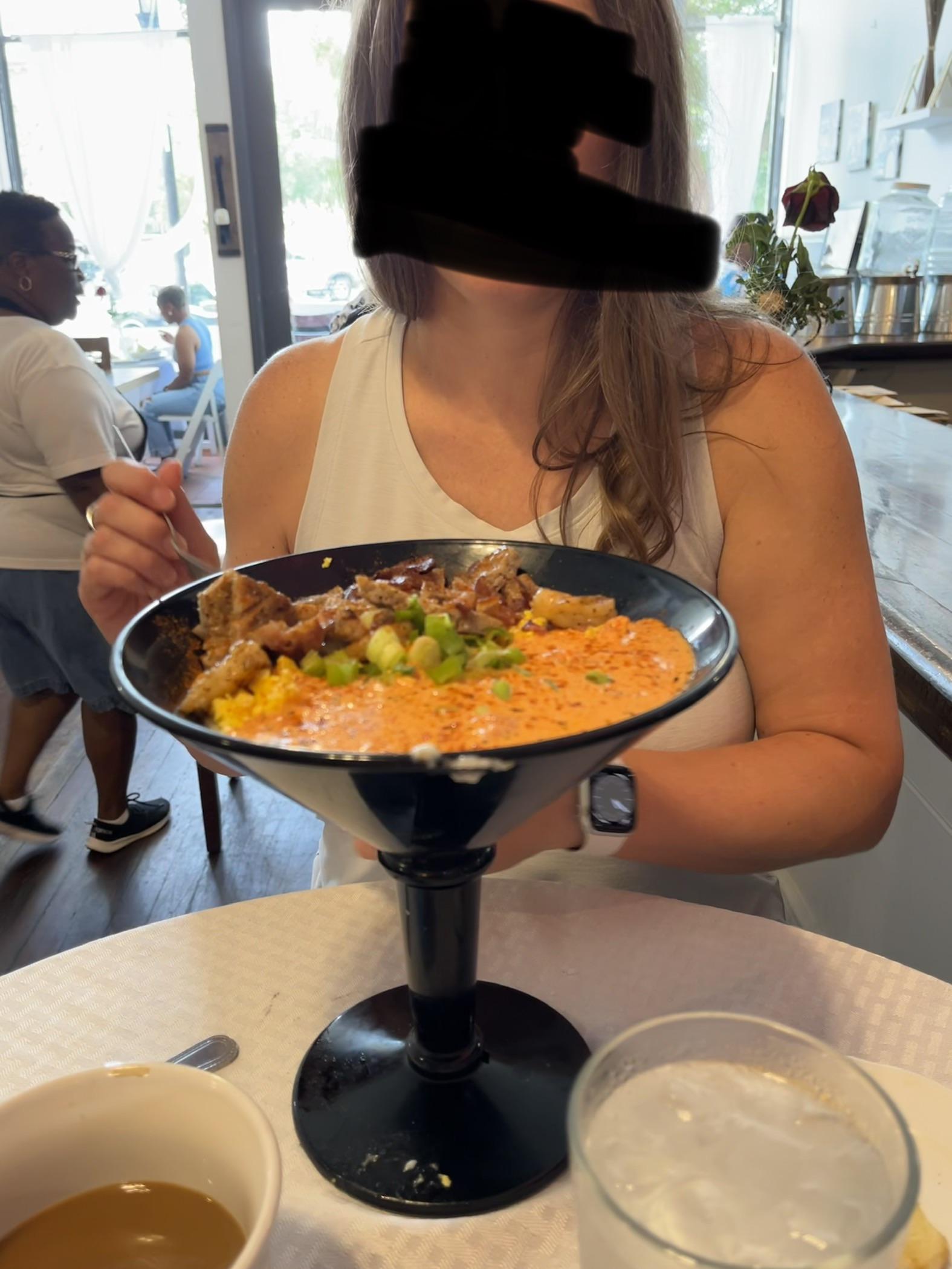 The Wife and I went to brunch after church today and she decided to try the restaurants take on shrimp and grits. For some reason, they decided to serve it in a FUCKING HUGE ASS NOVELTY MARTINI GLASS.