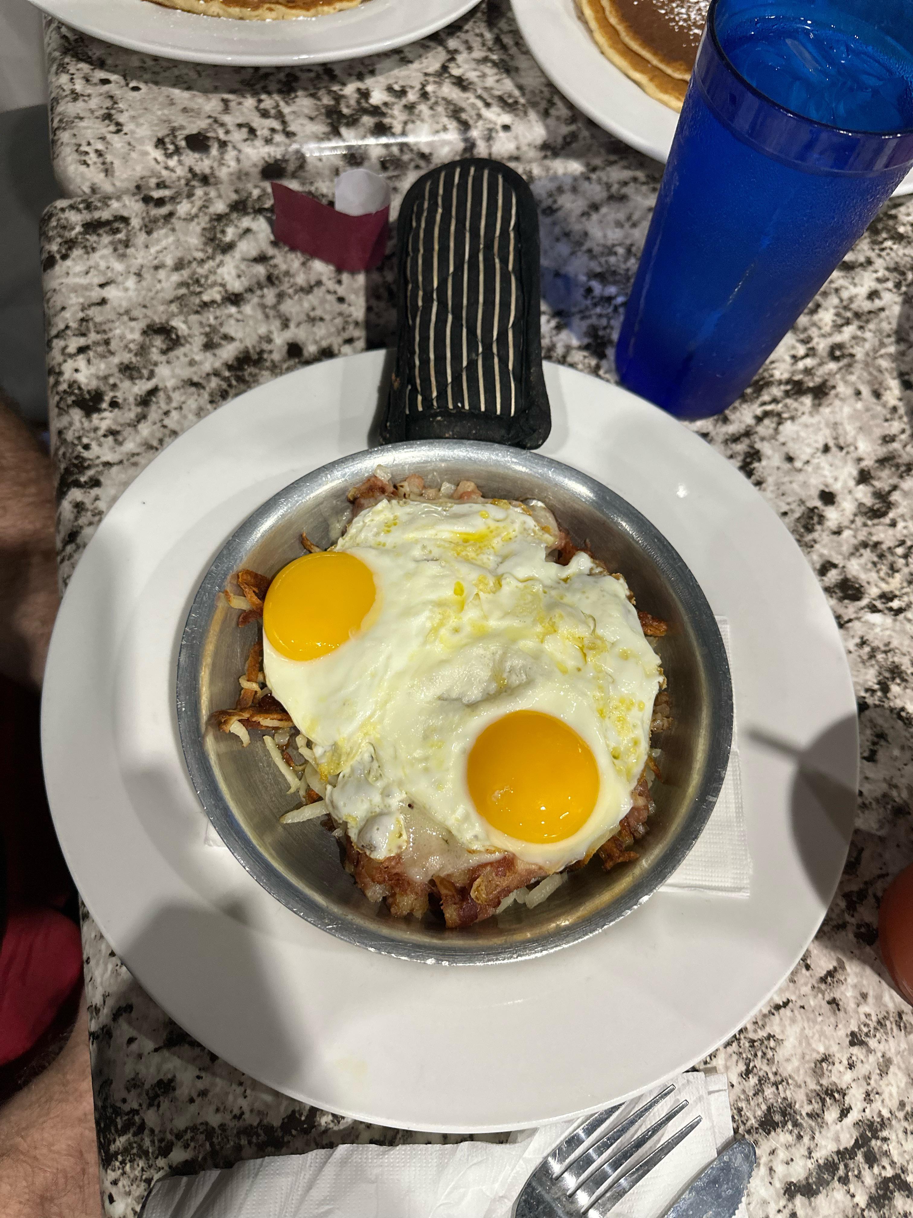That’s just to keep the hash warm and crispy before it gets to ya. There’s a plate literally underneath it you can move it to for eating.