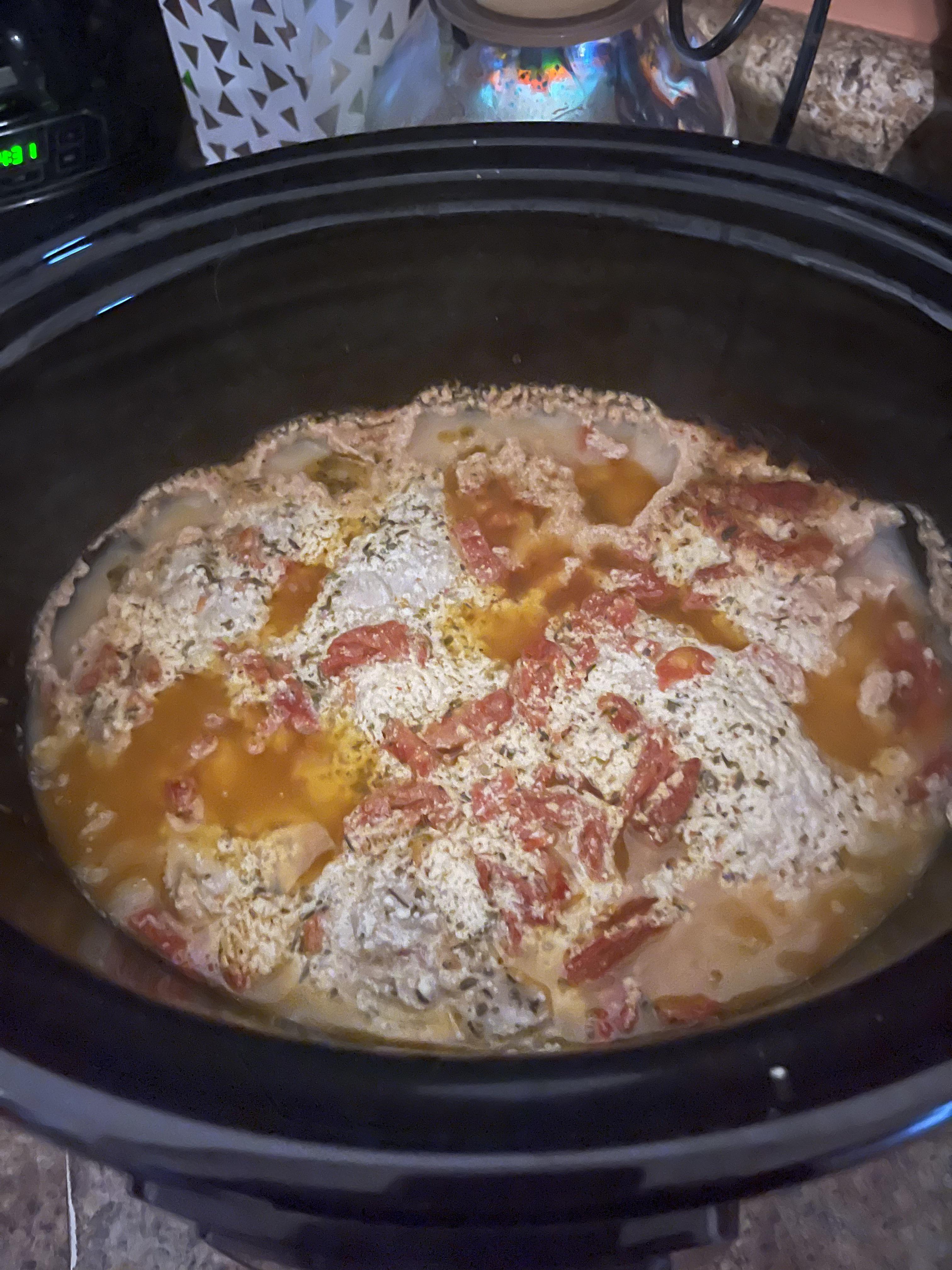 Place chicken in crockpot. Add in tomatoes. Mix together broth and cornstarch in a bowl and pour in pot. Add whipping cream and parmesan cheese. Cook on low 5-6 hours. Serve with rice, noodles or mashed potatoes.