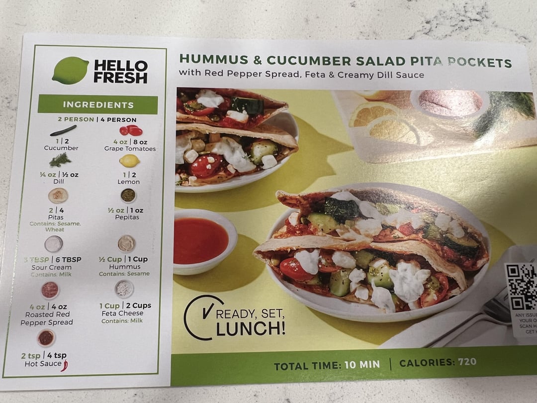 The pita pockets came with no pocket. Wtf? So I had to throw all the ingredients in and make it like a taco. Needless to say, it was absolutely disgusting IMO. Thus far the only HF meal I’ve trashed🤢🤮