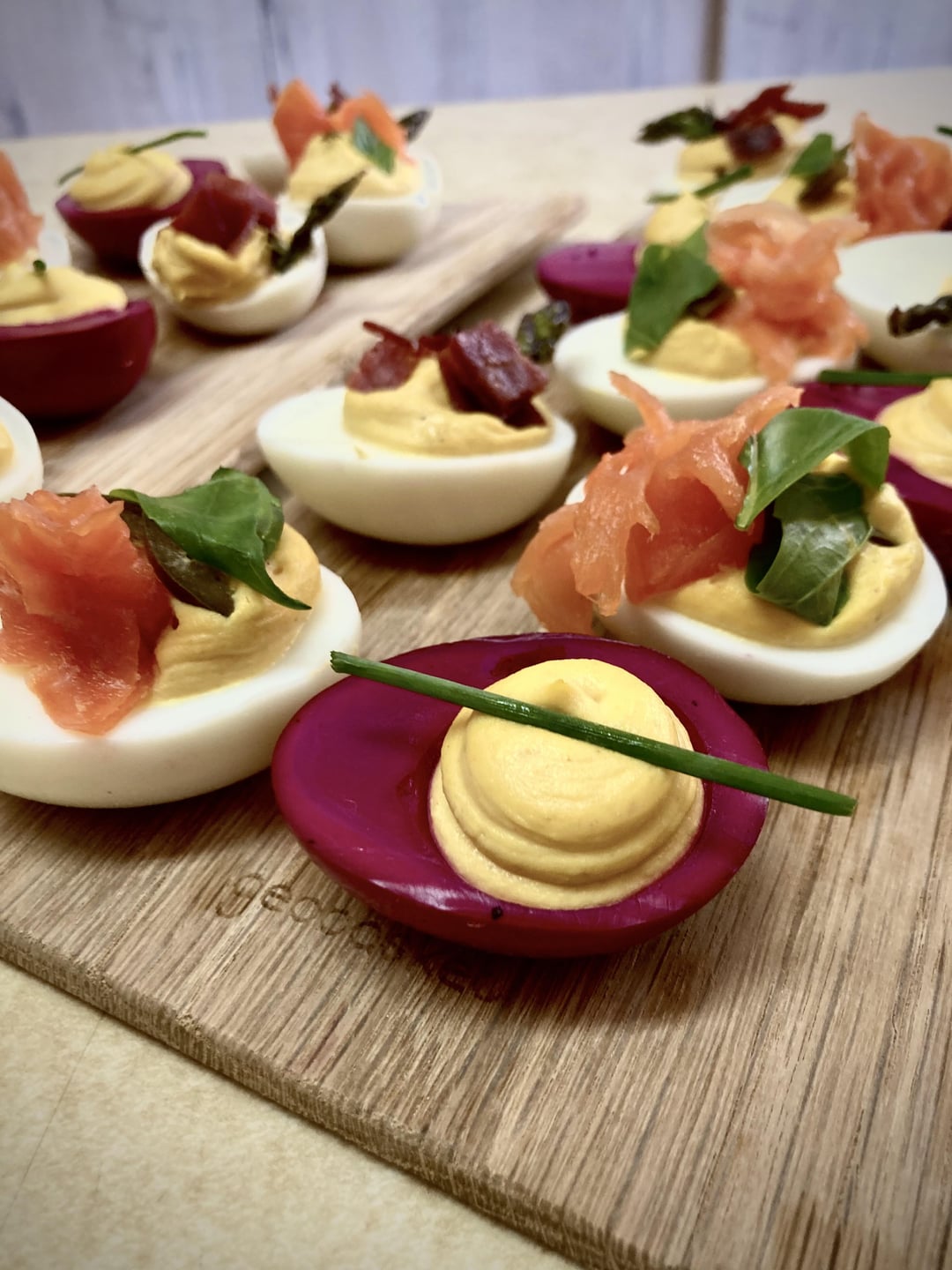 Easy and elegant Deviled Eggs made in 3 ways🥚 smoked salmon, pickled Beetroot and Asparagus with macon.