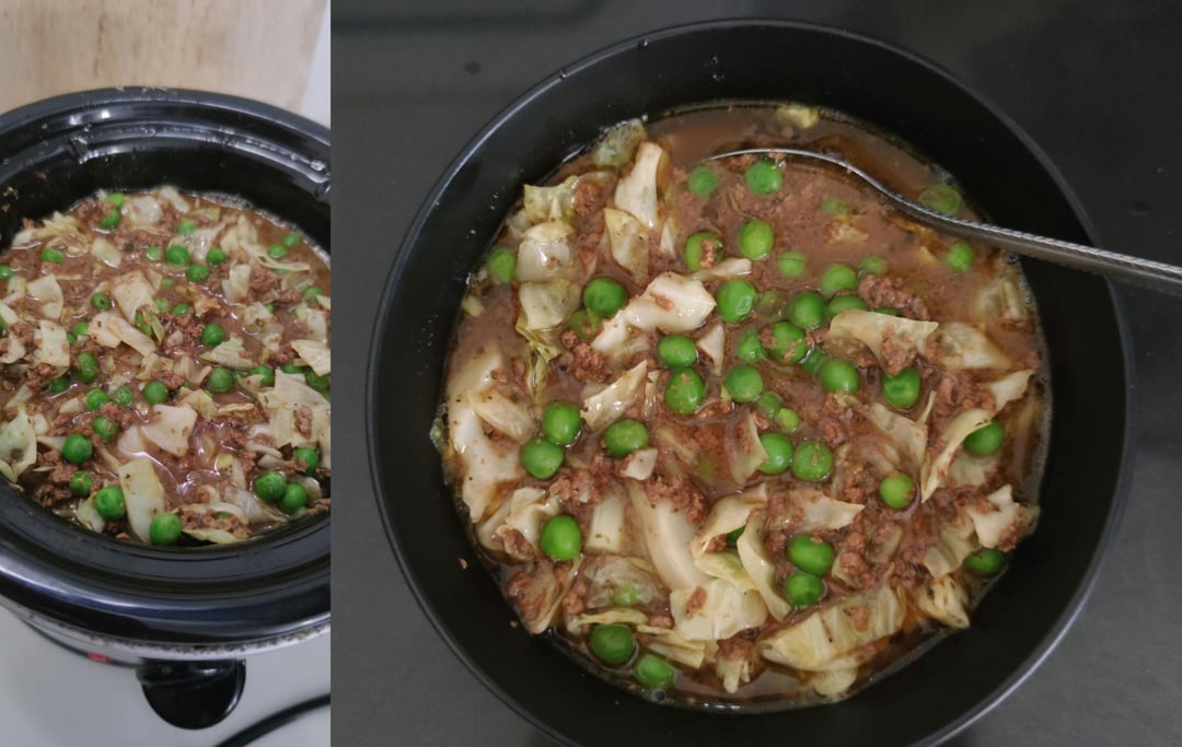 foxvipus 2 years ago Recipe (done in a 1.5l slow cooker) :350g Beef mince prime1β cups boiled waterMaggi chow mein packet3tsp basil, 2tsp tarragon2tbs Tabasco sauceSpatula to break up mince, stirred then left on high for 60+ minutes and switched to warm whilst completing the following –ΒΌ cut of cabbage sliced & diced mixed in and steamed 150g baby peas. Add noodles to finish.