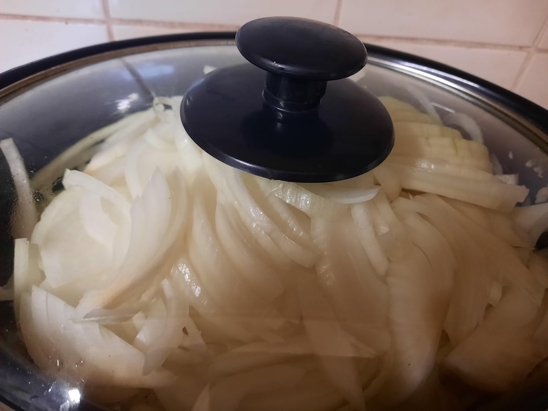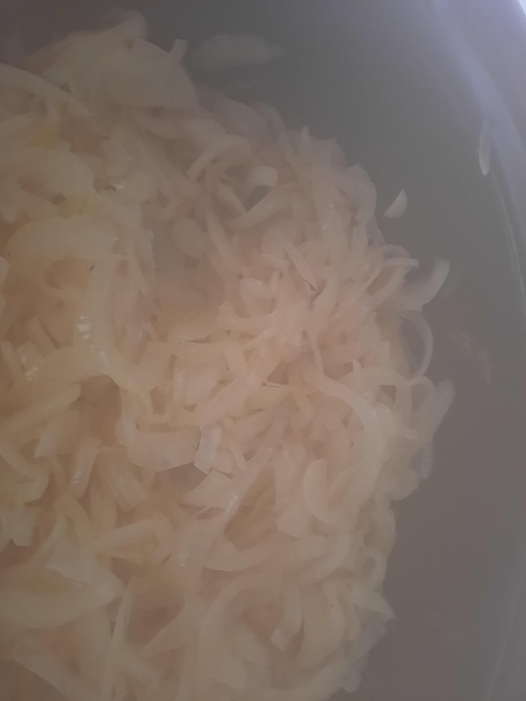 Approx 1.5kg/3lb of onions chopped with salt, pepper, a knob of butter, bay leaves and thyme.