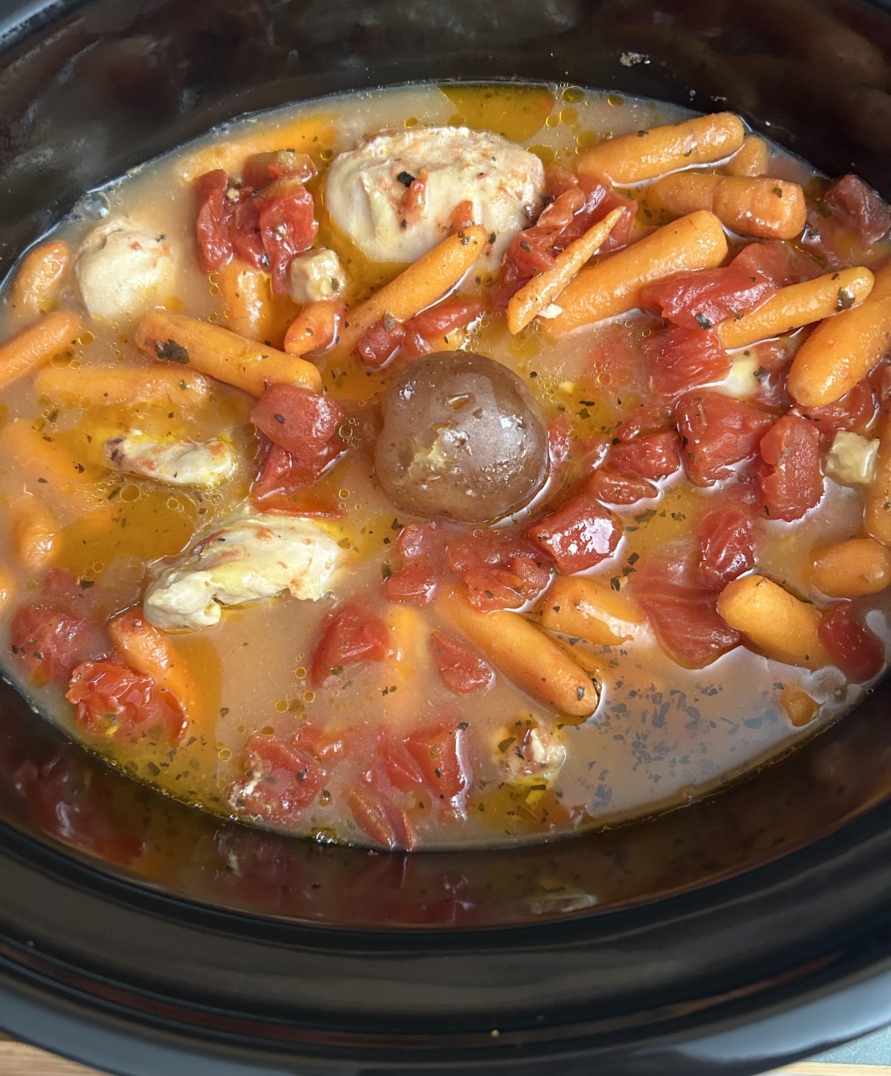 Boneless skinless chicken thighs, petite carrots and small round potatoes. I added half a container of chicken broth, a can of cream of chicken soup, and a can of seasoned diced tomatoes. Cooked on high for 5 hours. Veggies very tender!