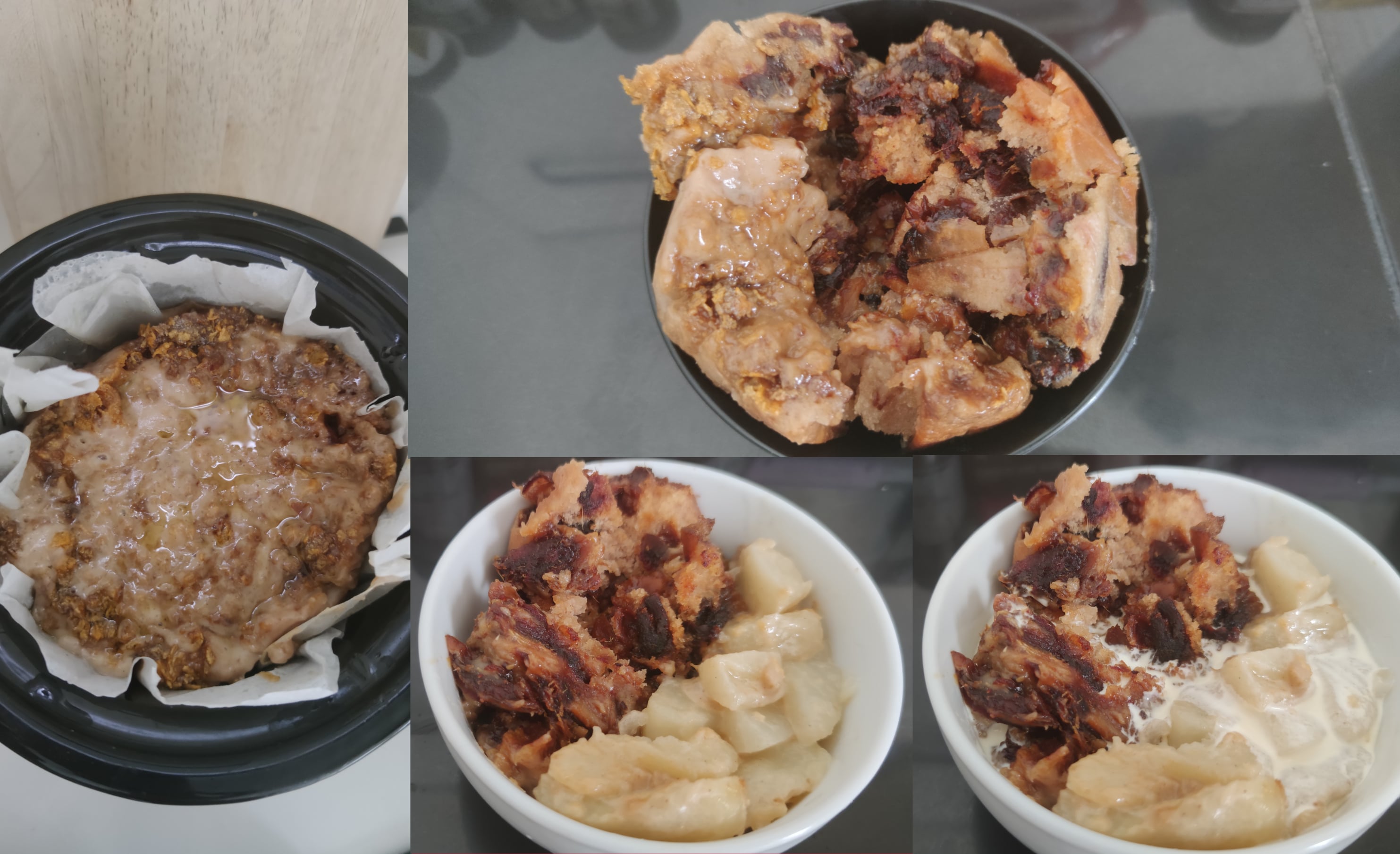 Warm setting for 40 minutes to rise. Added some crushed corn flakes, Jarrahs salted caramel powder and raw sugar. Covered with olive oil. Left on low for 30 minutes, another test with butter knife to check consistency then around 50 minutes on high. Served with warm apple slices and cream.