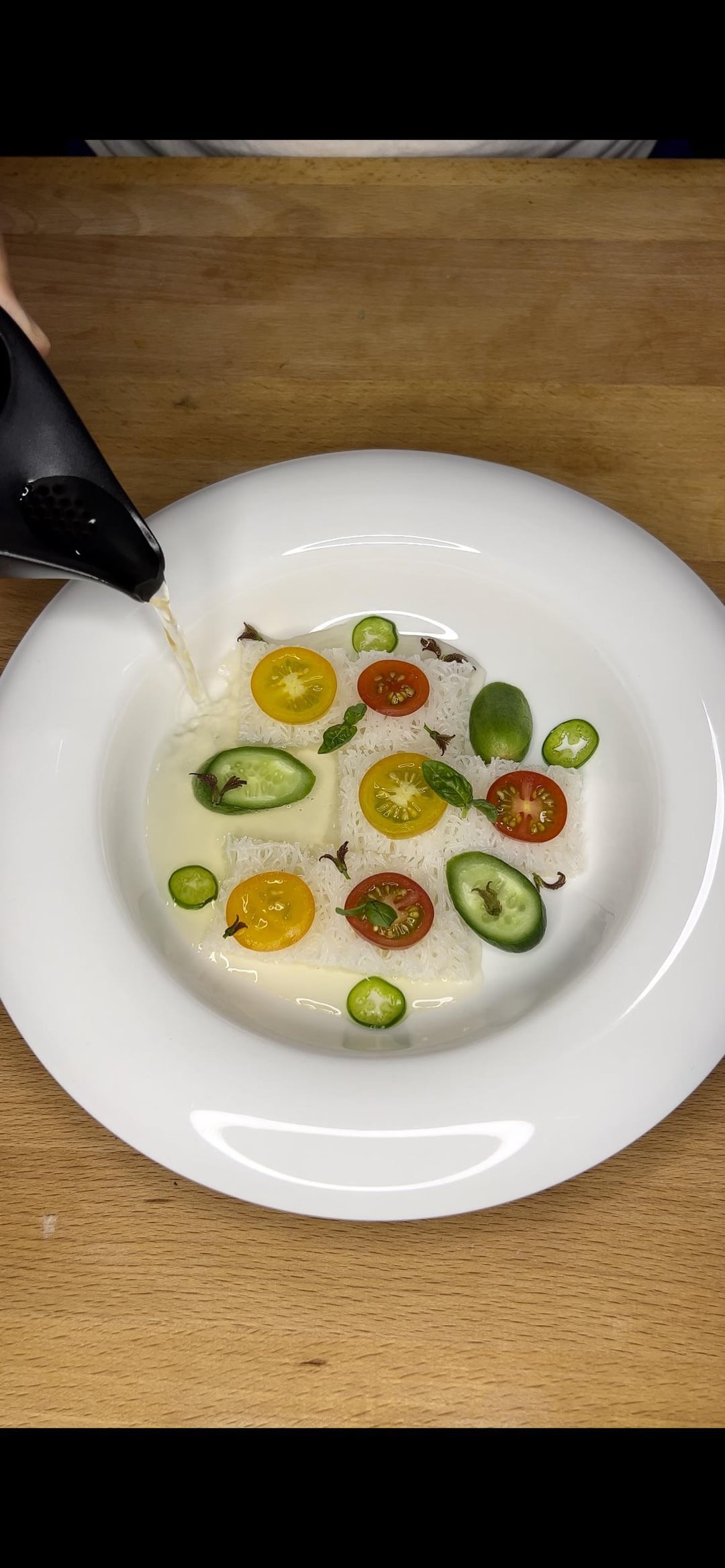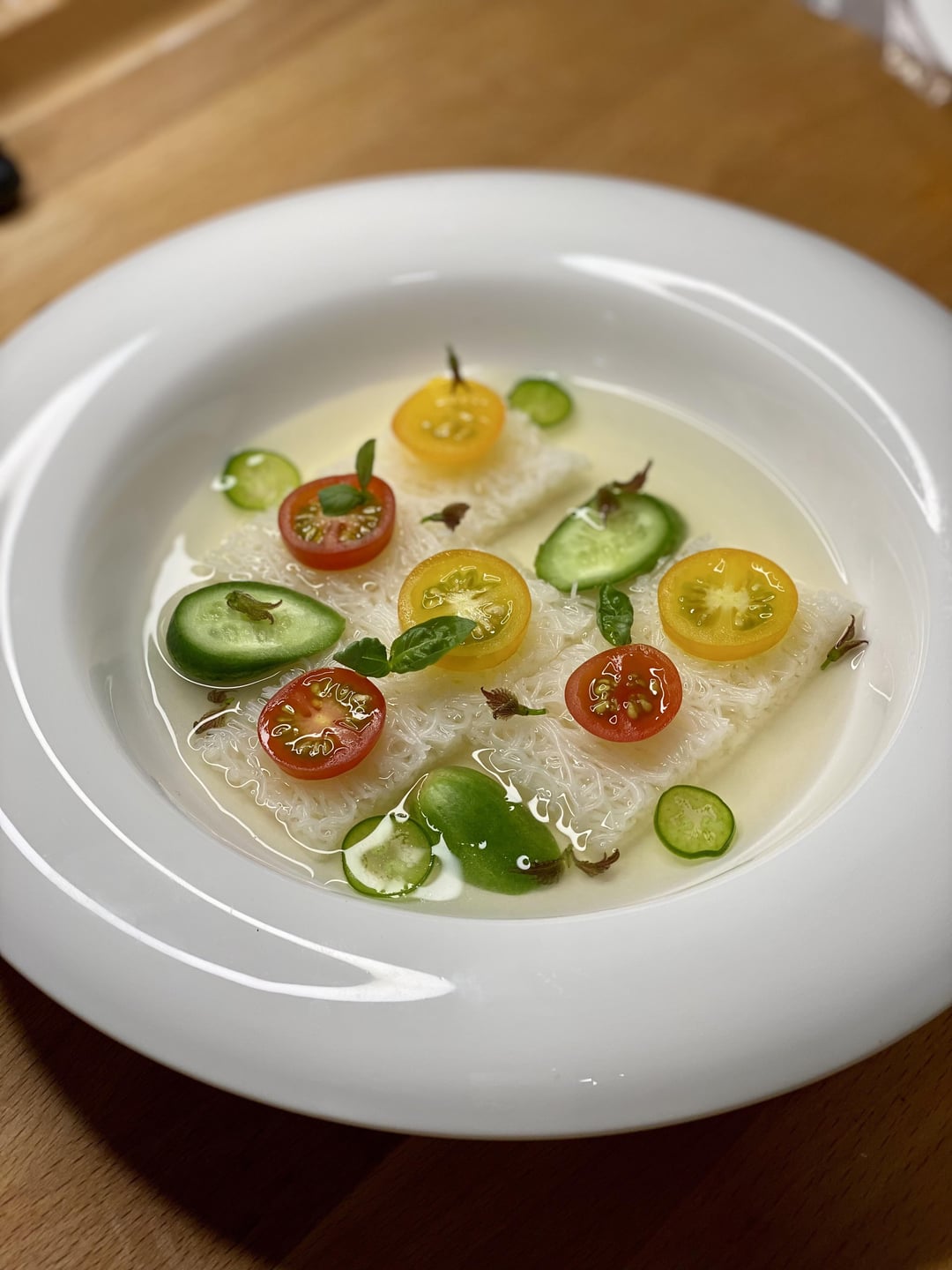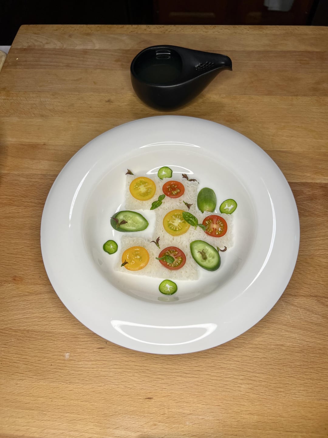 Spicy Tomato Consommé- lemongrass ginger tomato water, tomato, cucumber, jalapeño, rice noodle, basil, purple shisoby kytran40 Write A CommentYou must be logged in to post a comment.
