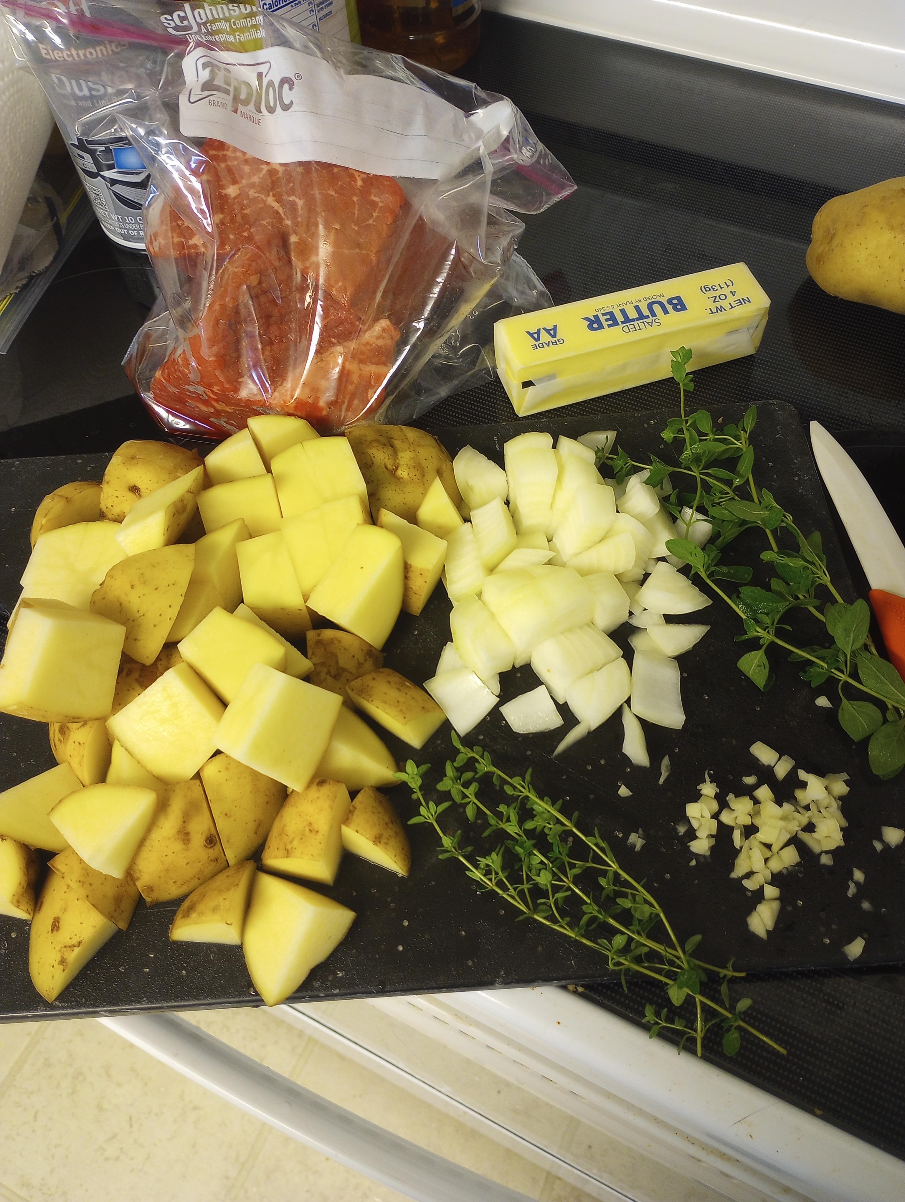 Every single ingredient on the cutting board came from my garden. We have gold potatoes, sweet yellow onion, thyme (lower plant), oregano (upper right plant), and the smallest garlic I got. It was about two decent cloves. I’m excited for dinner tonight.