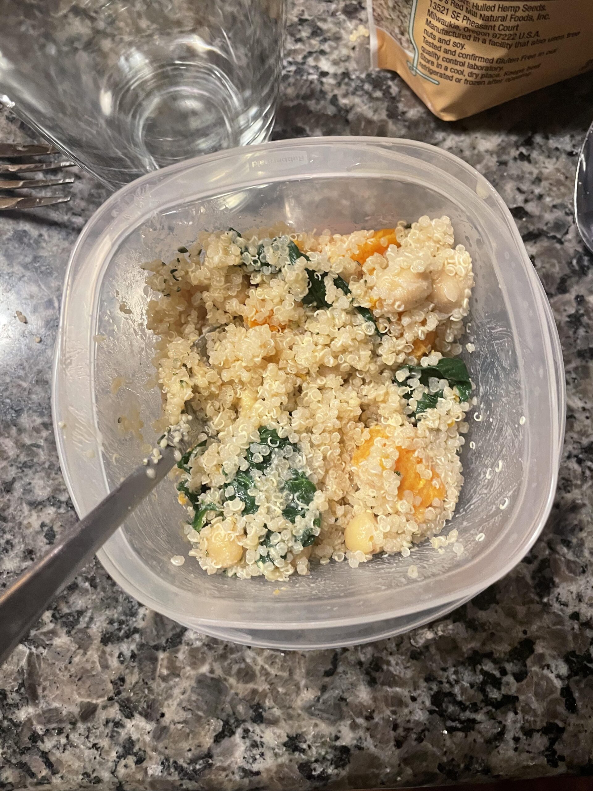 250 ish cals! This is 1/4 cup of dry quinoa (idk how much cooked), sweet potato, spinach, tahini with a little bit of lemon juice, chickpeas, and some hemp seed sprinkled on top. Wanted to try the hemp seeds but they made it a different flavor than what I was hoping, definitely going to leave them out next time.