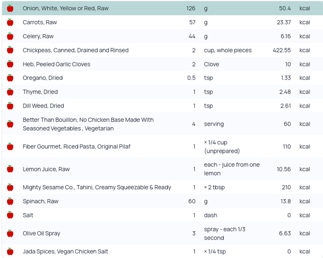 My changes – used lower calorie riced pasta for orzo (Fiber Gourmet, 56 g dry weight for full recipe), less spinach, only spray oil, no poured oil, 2 cloves garlic instead of 3, added a tsp of sugar, and dash of Jada Vegan Chicken Salt for color and flavor. Also, opted for Better than Bouillon No Chicken broth instead of veggie broth.
