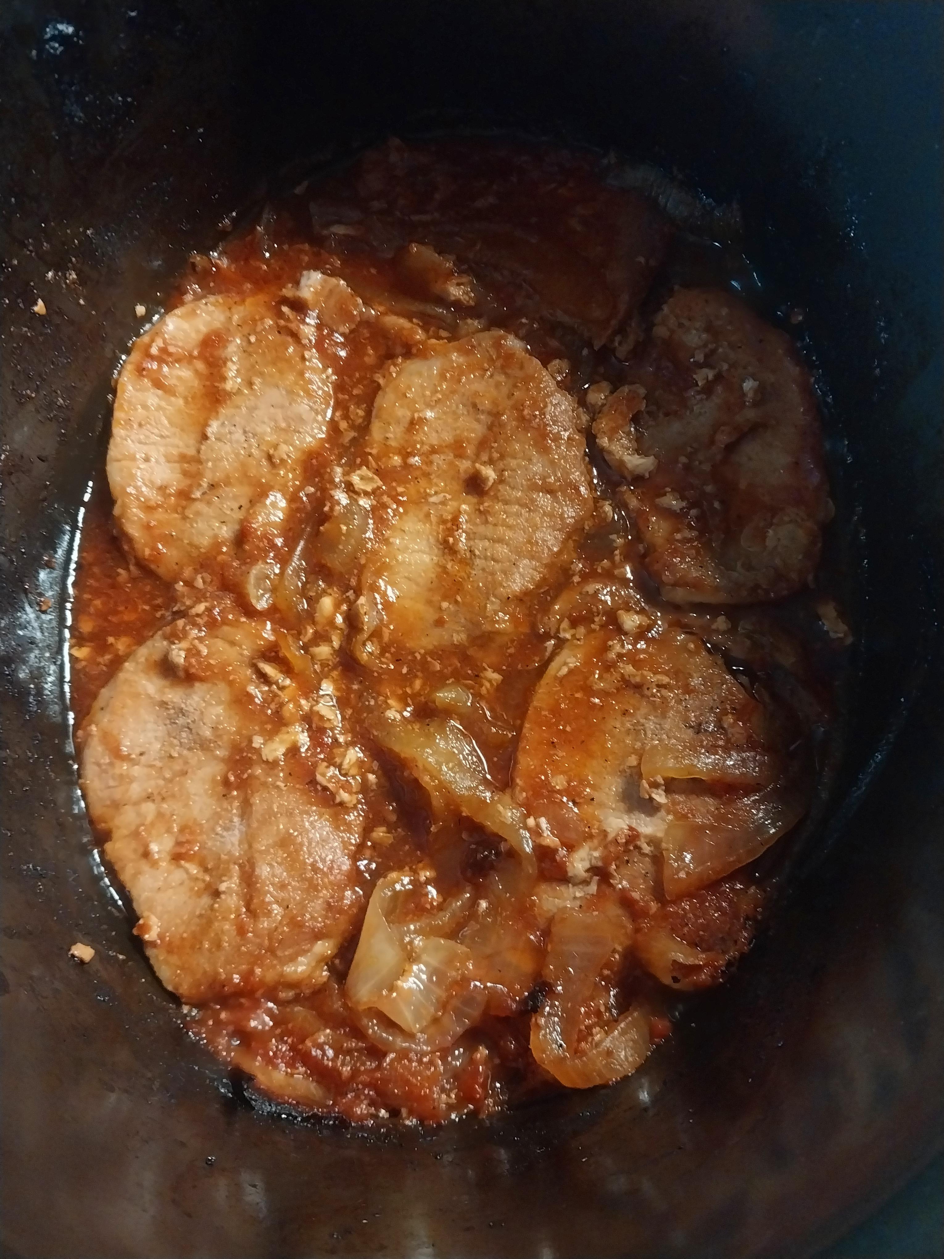 leftopinkocommie 2 years ago 1 lb thinly sliced pork chops4 oz of Ketchup1/2 an onion choppedGarlic powderBlack pepperBrown sugarSeasoning saltCook on high for 4 hours