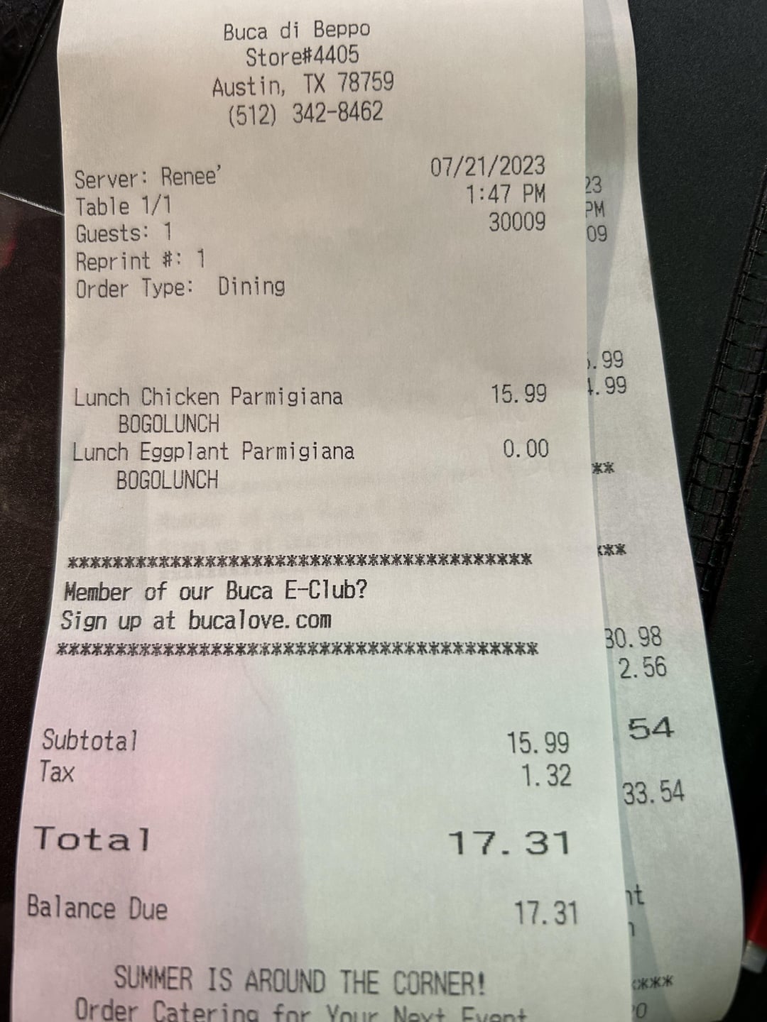 FWIW, Maggiano’s in the Domain has a standing “buy an entree, get a classic pasta to take home for 6 bucks” deal, prices aren’t that much higher than Buca, and I’m guessing the food is a bit better.