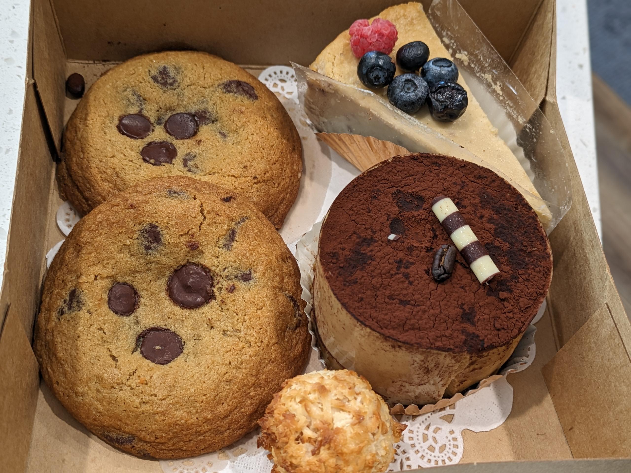 Chocolate chip cookies, coconut macaroon, tiramisu, and mixed berry cheesecake.