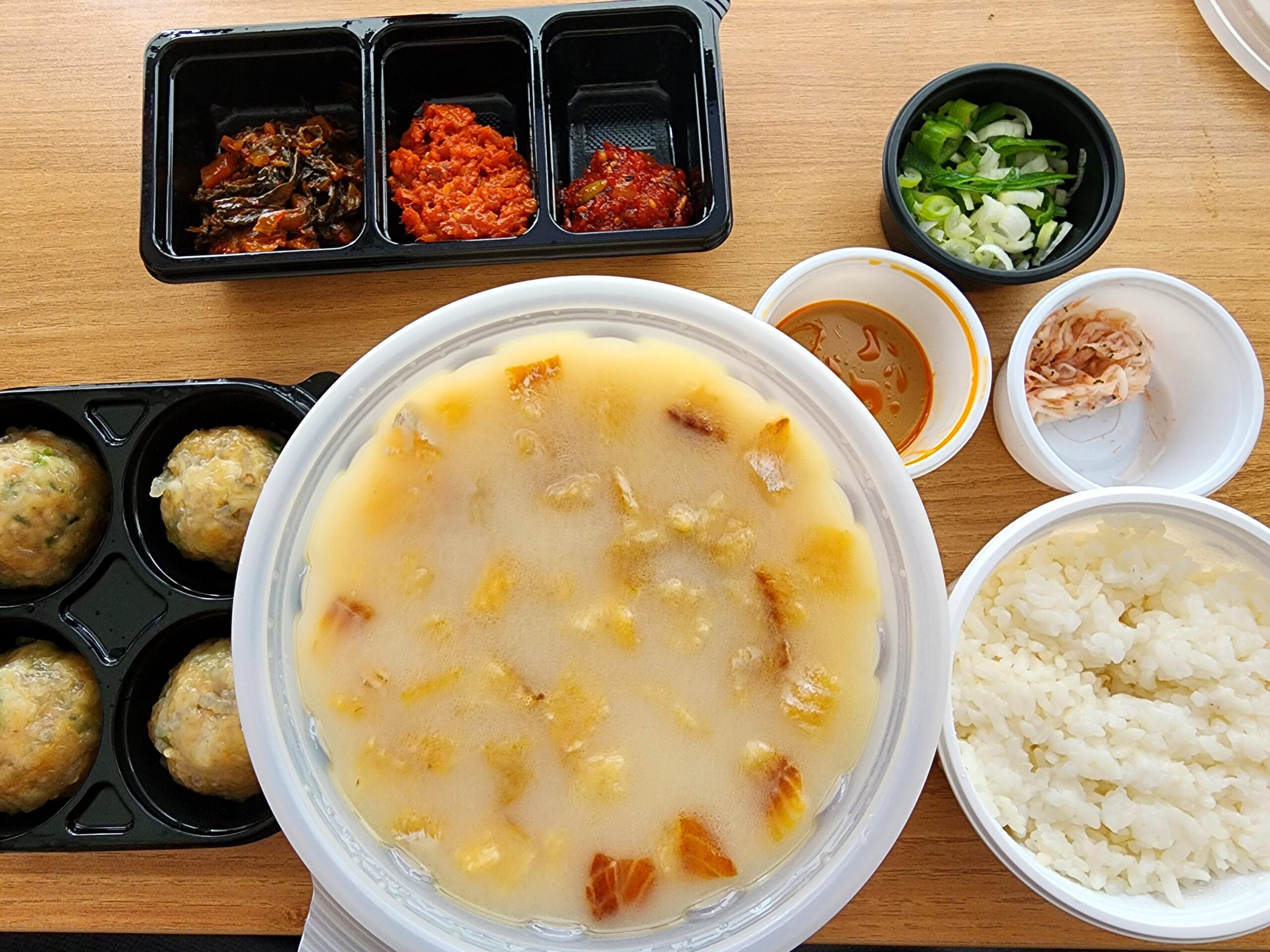 Hwangtae is dried pollock, and when boiled into a soup it gets rich and creamy without adding dairy, like a fish version of seollungtang. Next to it is some jeotgal as well as beef and hwangtae rolled mandu, which is mandu filling rolled in starch and steamed.