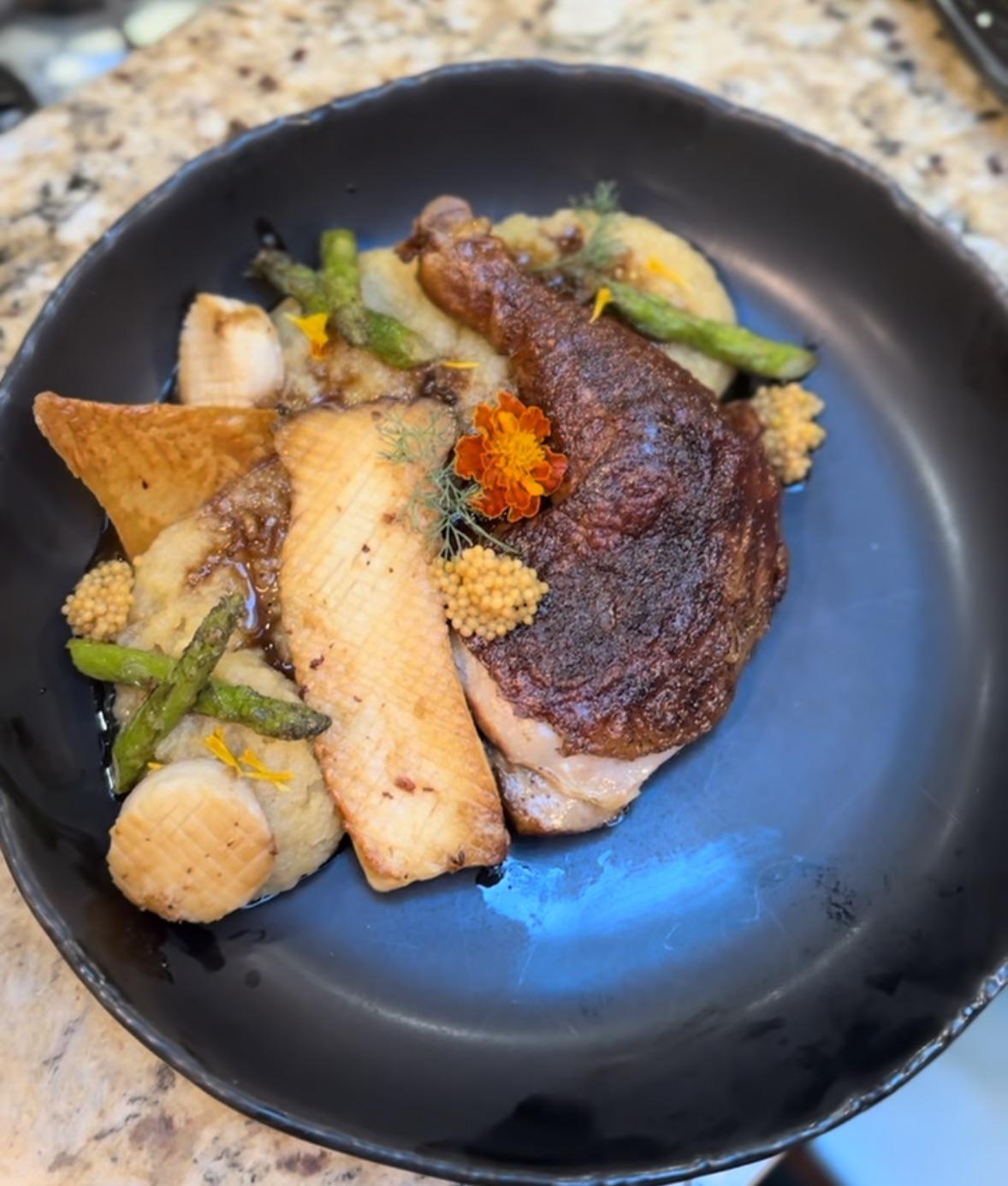 Ok the chicken. I’m curious. It looks as if you confit first, then smoked it, considering the skin is so dark. I think in fact it is too dark, especially with the choice of a dark plate. I would have smoked the chicken first to absorb all that initial flavor, and finished with the confit process. This execution keeps the chicken a lighter color, and it makes crisping the skin a nicer finish.
