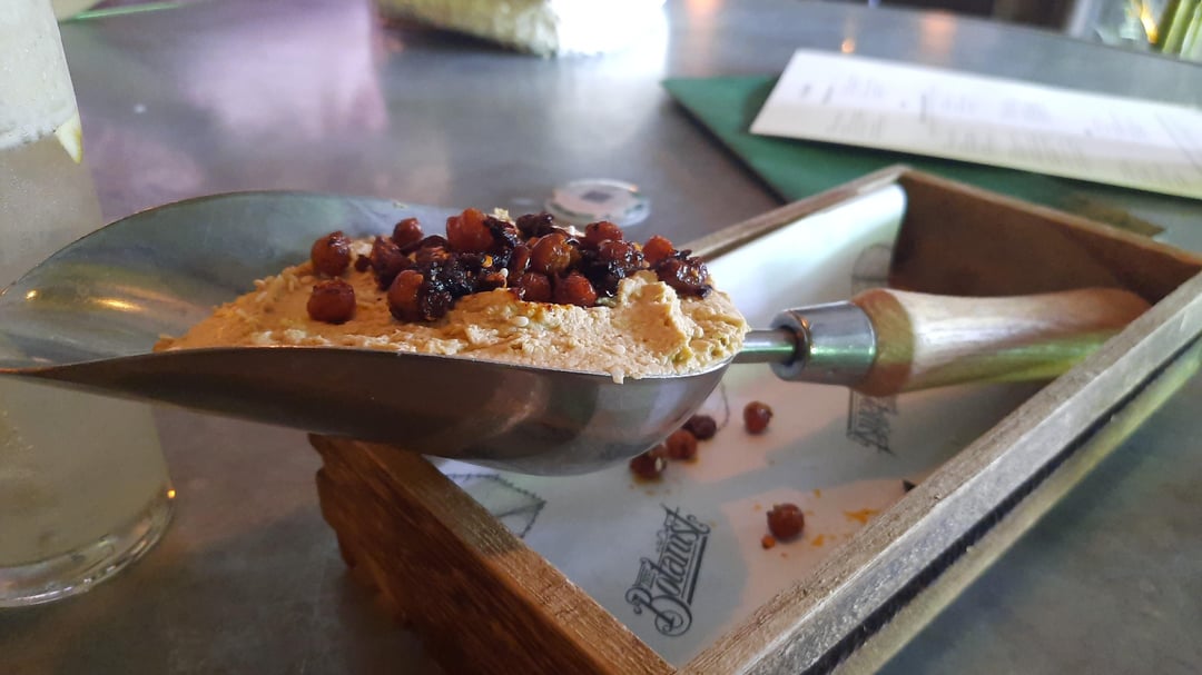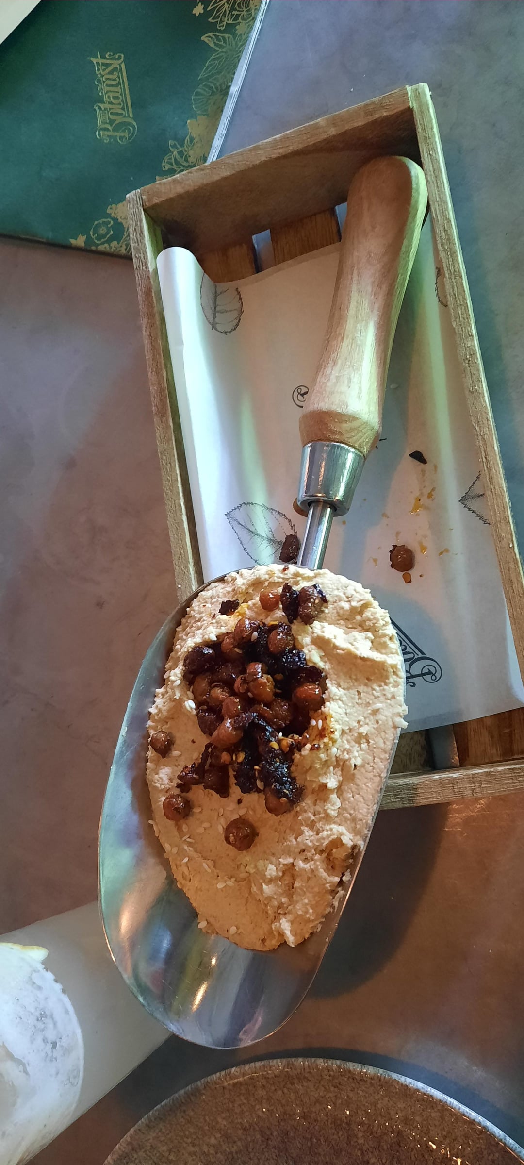 It’s a scoop, not a trowel. It’s probably for coffee beans or rice or similar dry food. Hummus isn’t dry food and wooden handles are hard to clean, so this is still stupid.