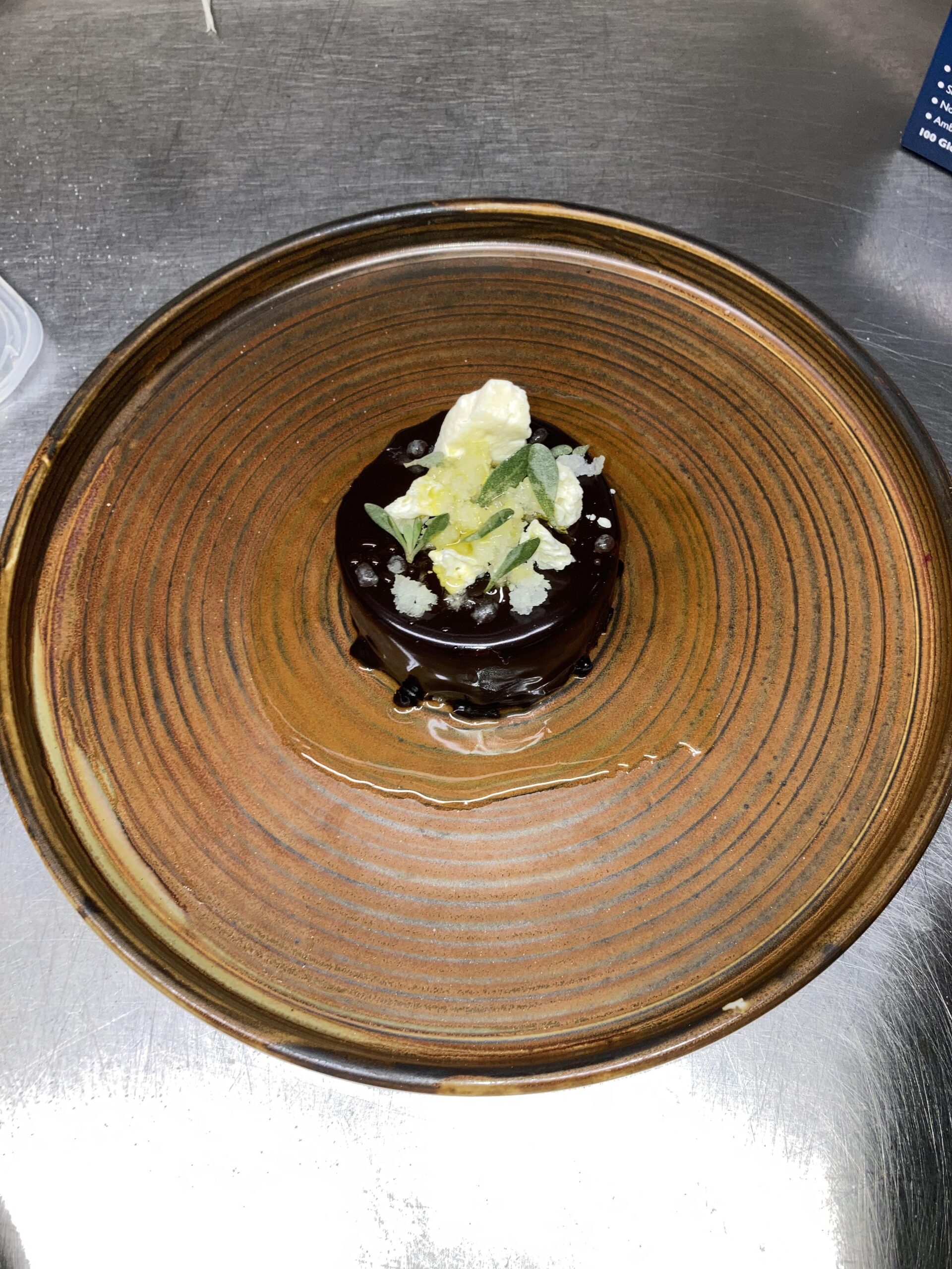 Aged dark choc, olive oil and orange delice, cardamom white choc aero, burnt orange honey, extra virgin olive oil granita and sea purslane