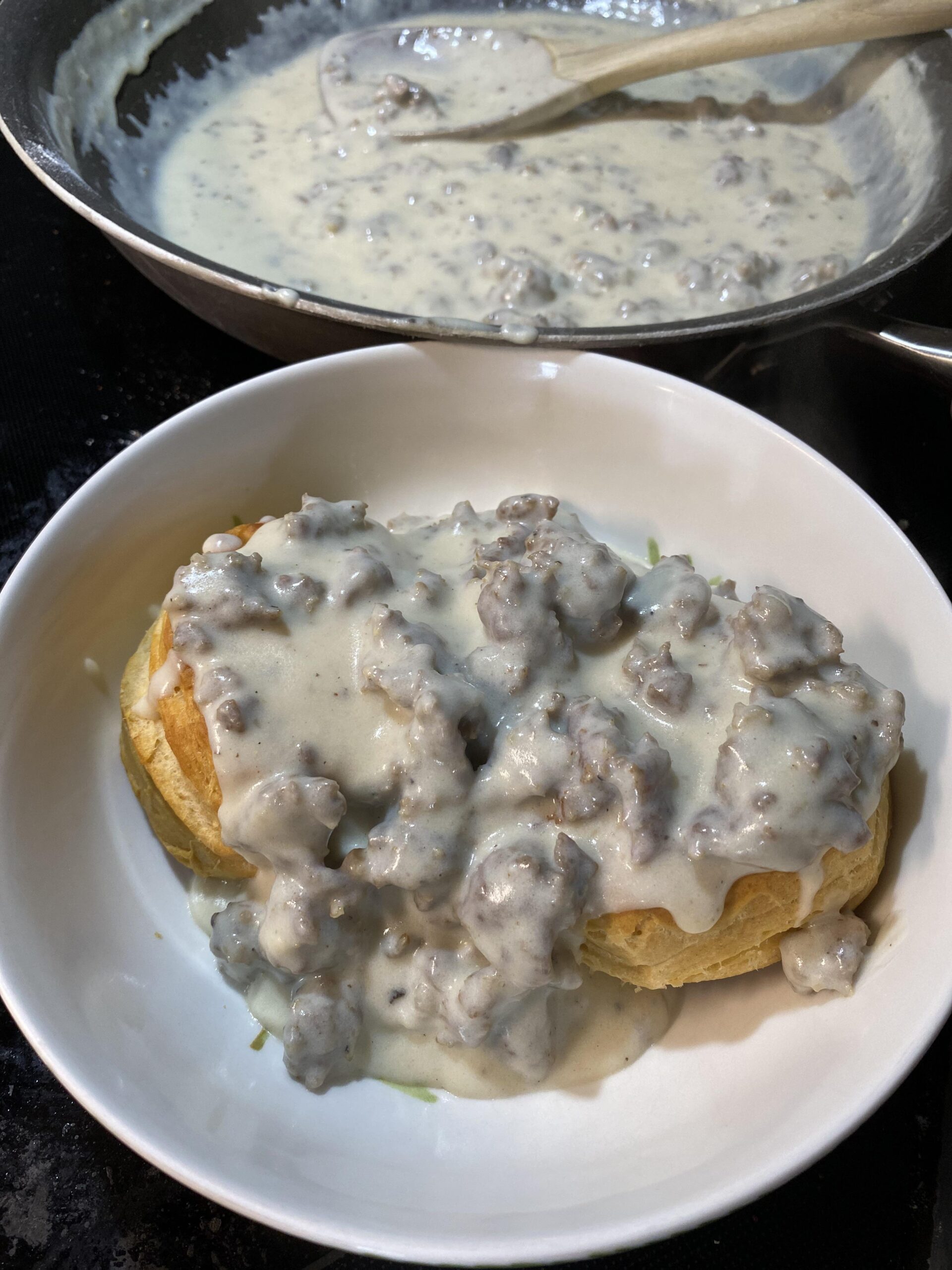 I’d tear that up, literally–tear up the biscuits before adding the gravy, to get a better contact ratio between them. Split the biscuits at least! Looks great.
