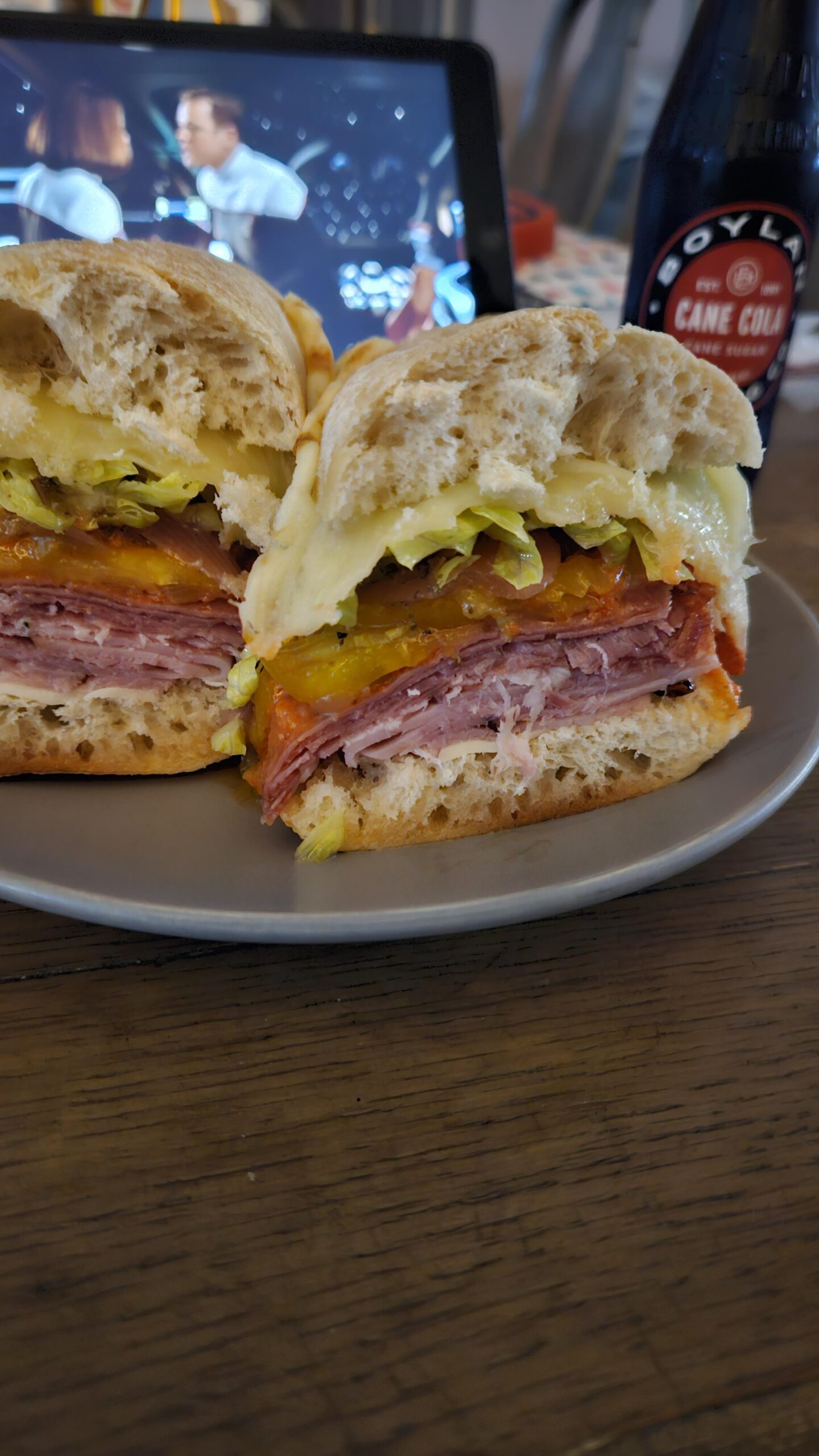 Black forest ham, capicola, sweet sopressata, salami, roasted red pepper aioli, pickled red onions and banana peppers, with provolone on a toasted Italian baguette.