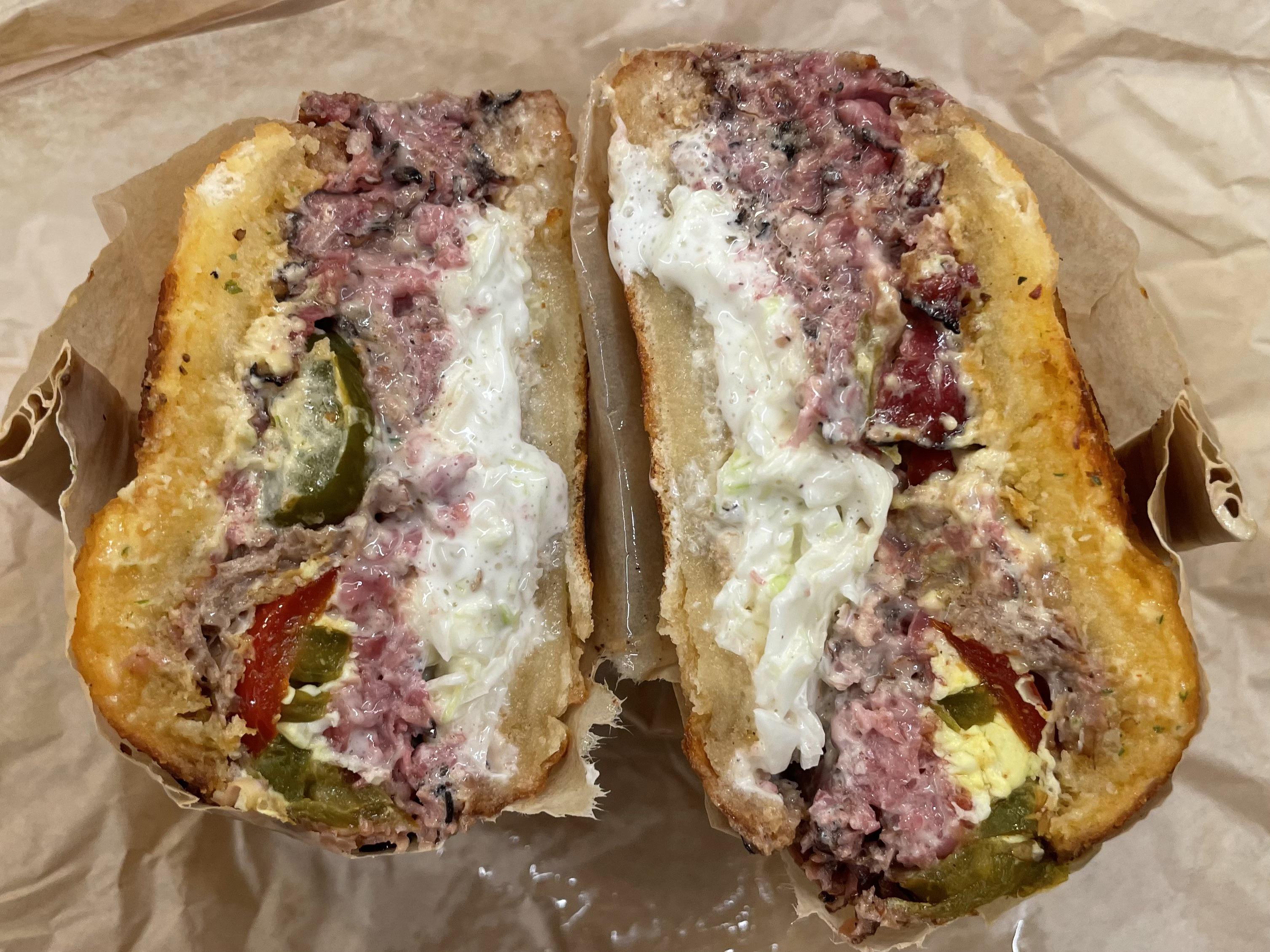 corned beef, pastrami, brisket, white american cheese, cherry peppers, cole slaw, 1000 island, Board sauce