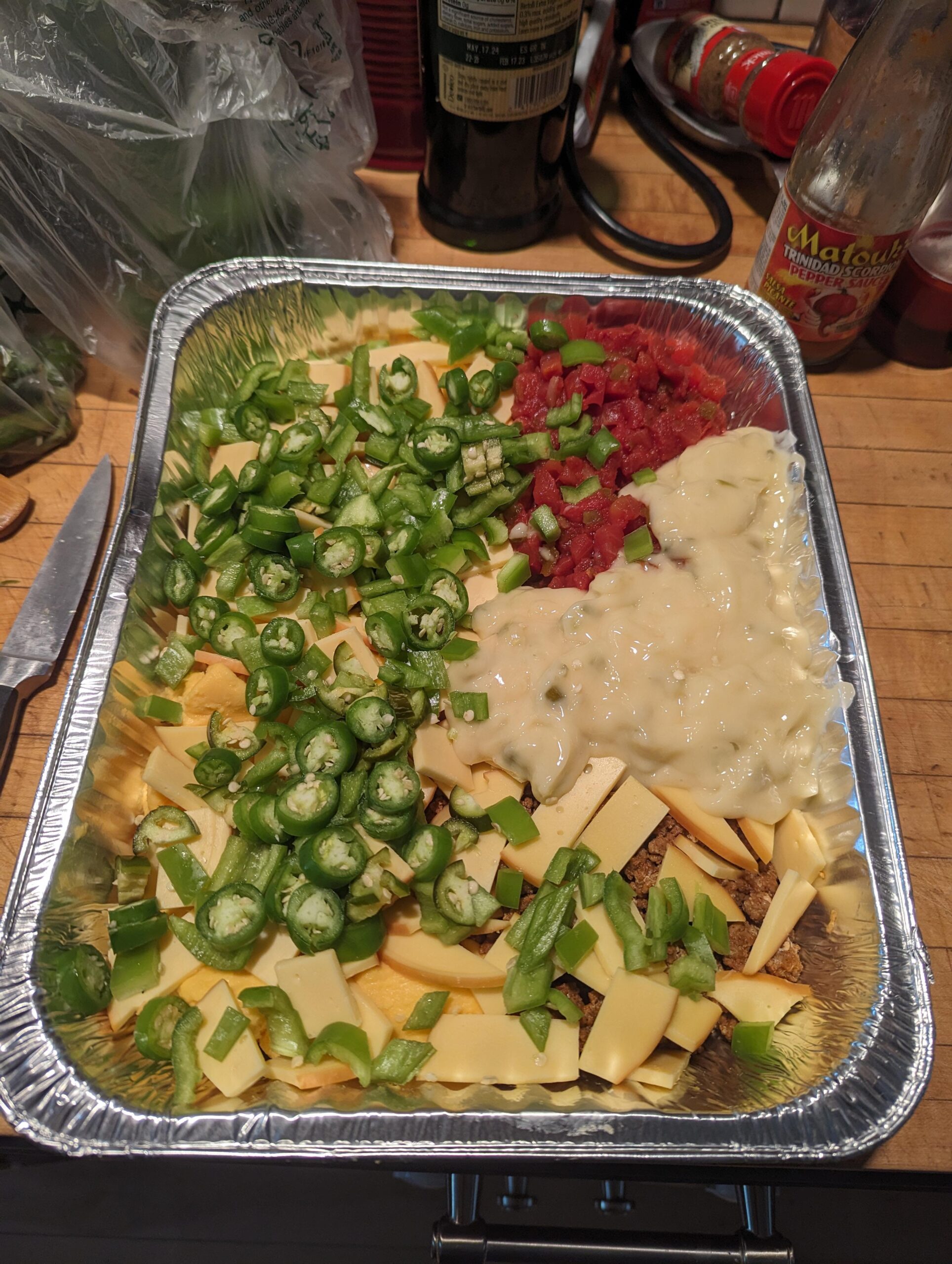 Share Facebook Twitter Pinterest LinkedIn Reddit 5 Serranos, 3 Jalapenos, 2 Anaheims + Spicy Chorizo Queso headed for the smoker by MOOzikmktr 1 Comment MOOzikmktr 3 years ago Recipe: 2 lbs Velveeta 2/3 lbs Spicy Chorizo 1/2 lbs Gouda 1 can RoTel 1 Can Cream of Celery / Mushroom / Jalapeno soup As many peppers as you like A few shakes of your favorite BBQ rub, or just regular pepper flakes 90 minutes – 3 hours at 300F in a smoker Use lighter fruit woods like Cherry, Apple or Pecan Stir after an hour, then again every 20 minutes Write A CommentYou must be logged in to post a comment.
