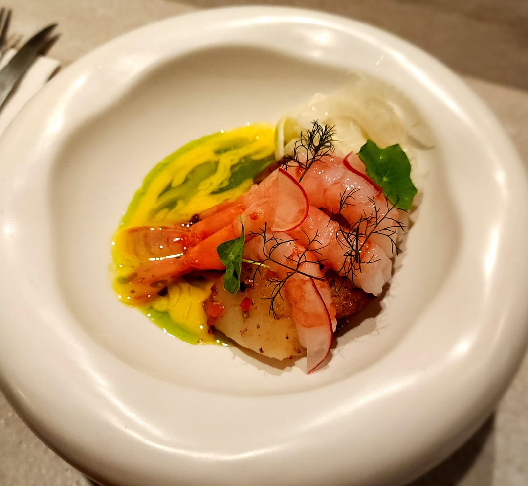Key clams and sweet shrimp, fennel pickle, chive and cheongyang beurre blanc, some type of pickle relish(19000): really fun! The shrimp is raw and the clam has been lightly seared. The beurre blanc is great and the green sauce adds an interesting vegetal kick; enough to distract from the richness of the butter, but I almost wish there had been more of it. Fennel pickle is vinegar and sugar it seems like, nothing fancy but provides a nice acidic bite and textural contrast. Some type of pepper relish too adds a bit of kick in addition to the green sauce.