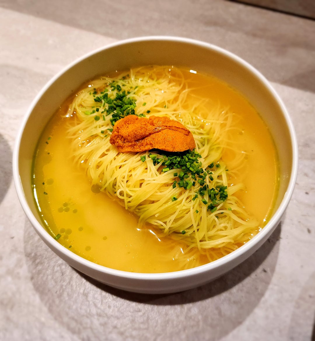 Uni onmyeon, chicken and hwangtae broth, same chili chive oil, uni, chive, cappellini pasta(25000): surprisingly strong. It was one of the signature dishes so I ordered it despite not expecting much, but each of the flavors really work well together. The broth is rich already but I was recommended to dissolve the uni in the broth, which gave it a briny and seafood undertone that I really enjoyed. The cappelini was really similar to somyeon, perhaps a bit firmer, and the oil gave the same kick