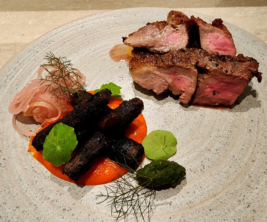 Iberico pluma, soy braised roasted burdock, red pepper romesco, cheongyang pesto, miso sauce under the pluma(32000): really excellent. Pluma cooked to a hair above medium rare (which good pork really is best at) and the accompaniments stand out but don’t distract. Burdock had a firm bite like a typical braised soy tsukemono but the charring gave it a bitter complexity and made it more pliable than normal. Romesco was surprisingly spicy but you almost got both the sense, visually and tastewise, as if you were eating log of wood out of a hot campfire – really fun. Cheongyang pesto was pretty one note but helped break up the richness of the pork. The pickled onions had dill both as a garnish and in the brine, I think.