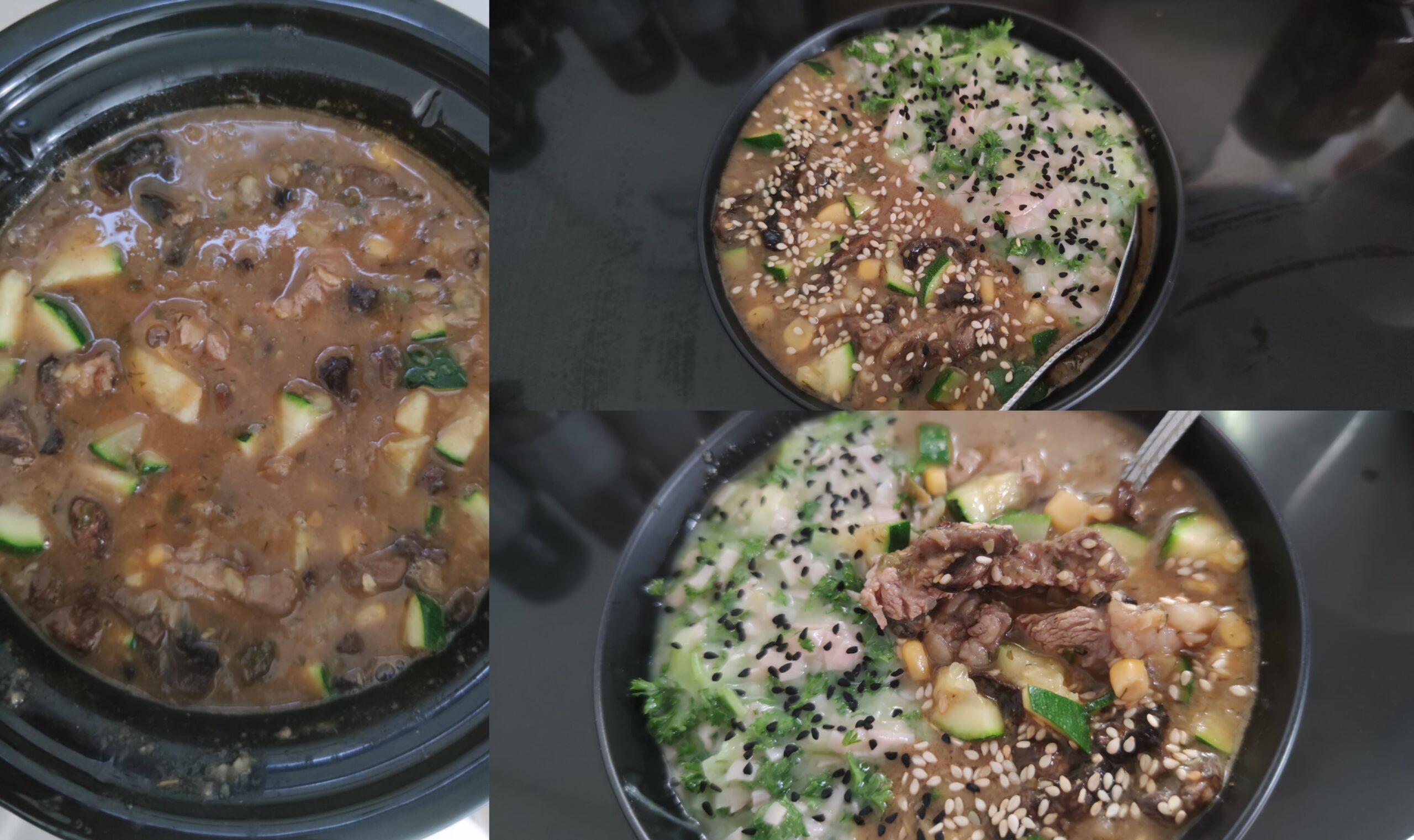 1 courgette cut small dice, steamed, mixed into slow cooker.