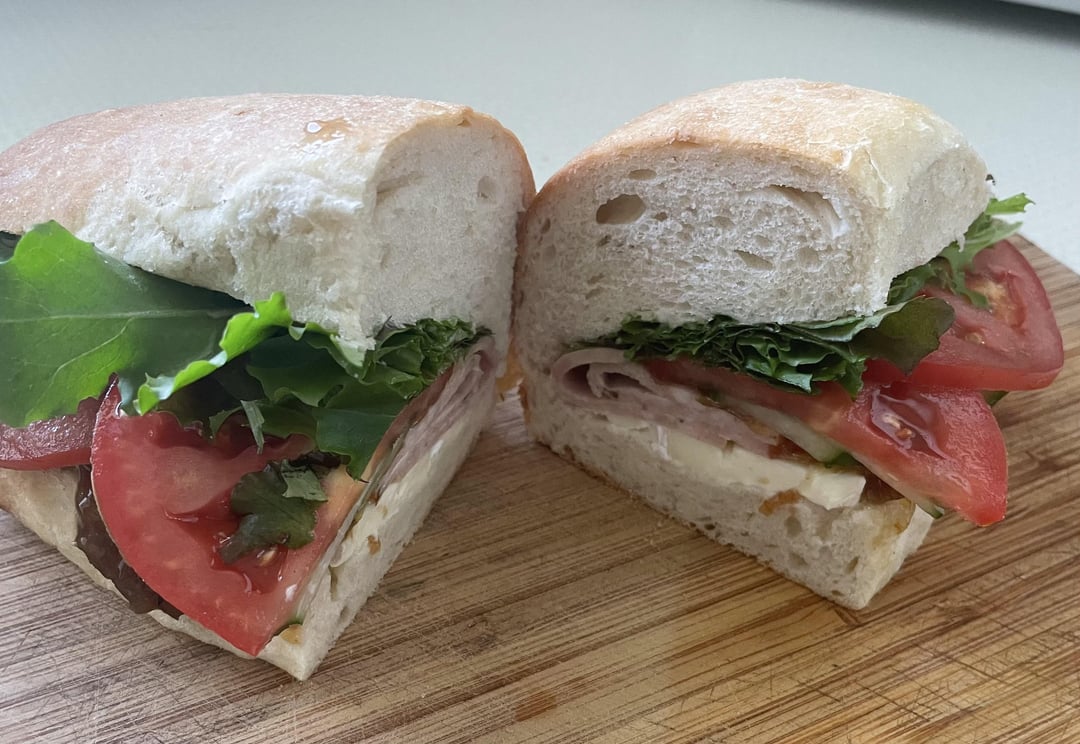 Home made hoagie roll with brea, haslet, tomato, cucumber, lettuce and onion chutney