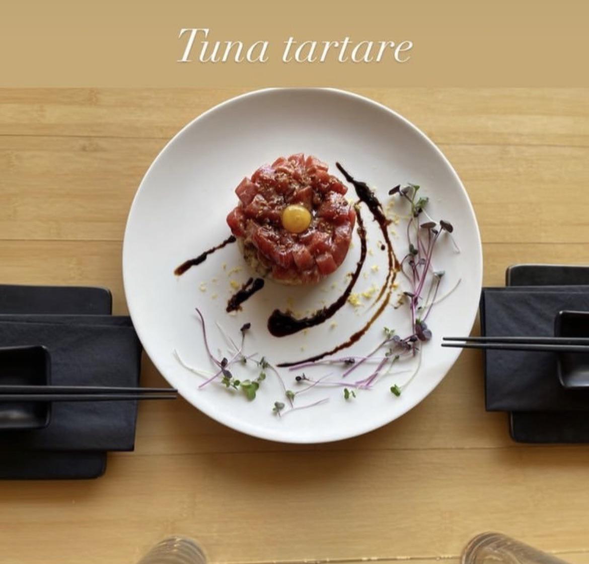 Bluefin lightly tossed in wasabi aioli over crispy rice, local quail yolk and micro greens, fish sauce/balsamic reduction and fresh lemon zest