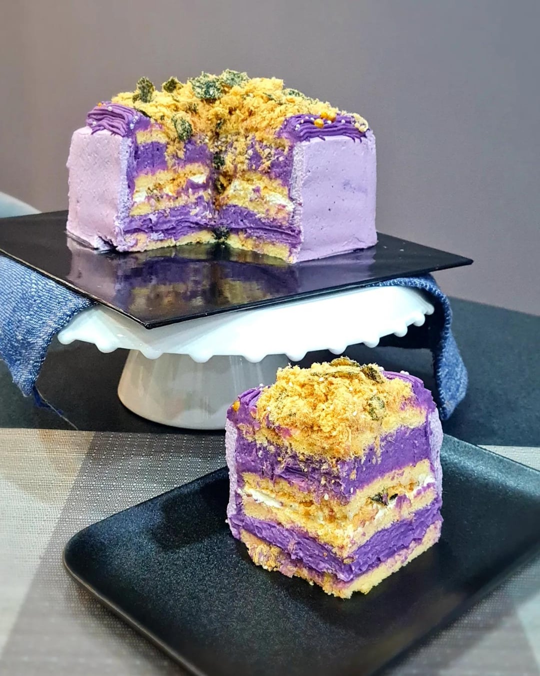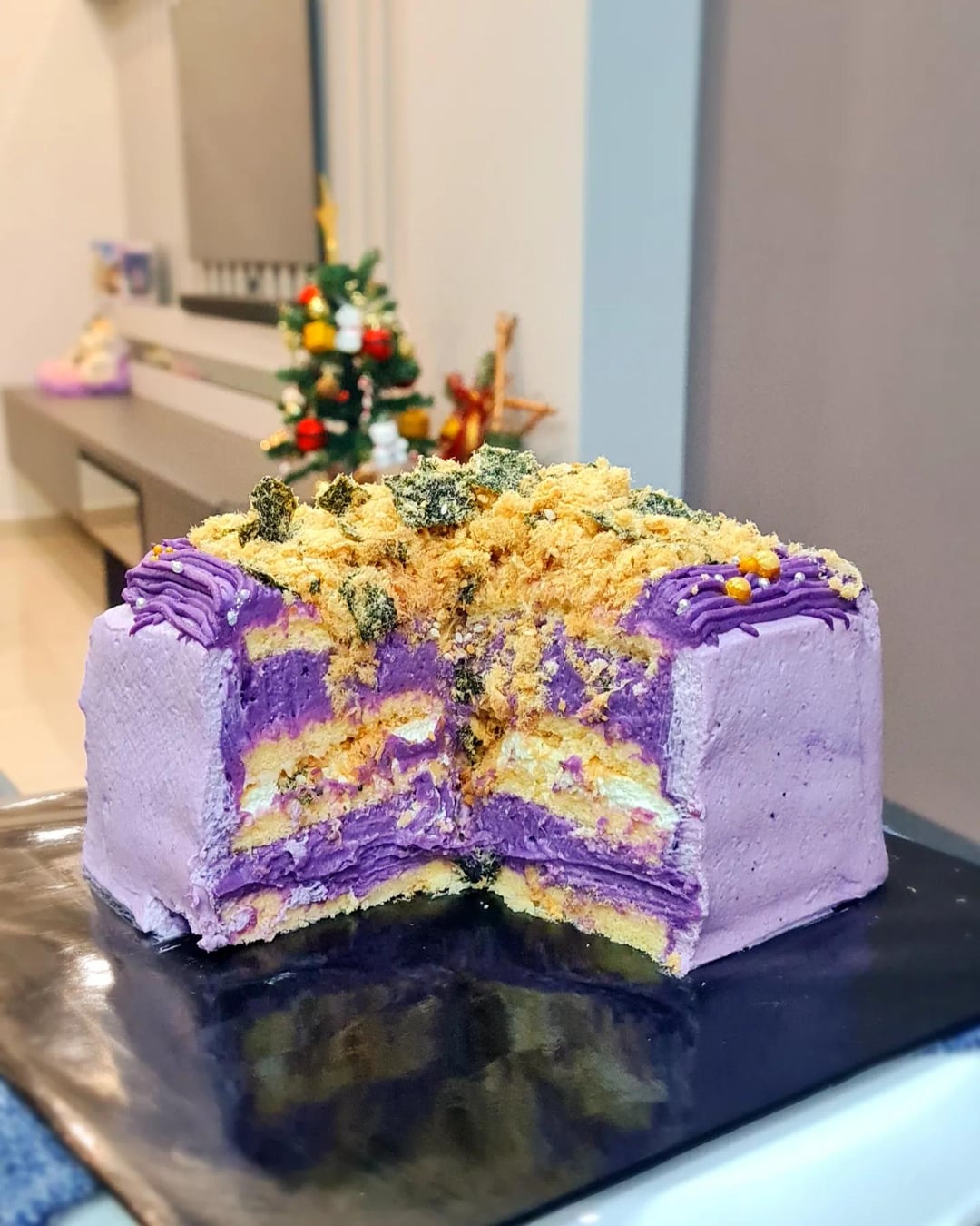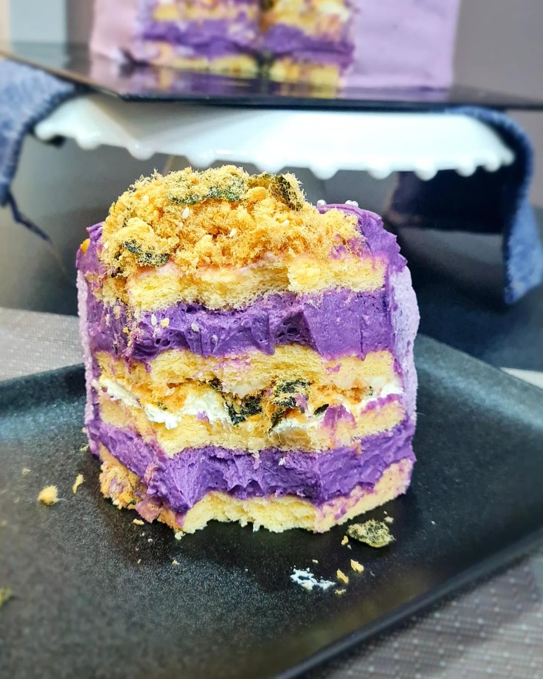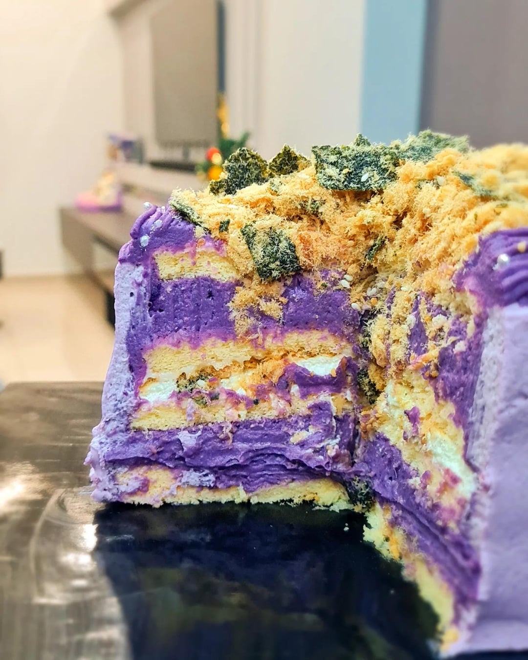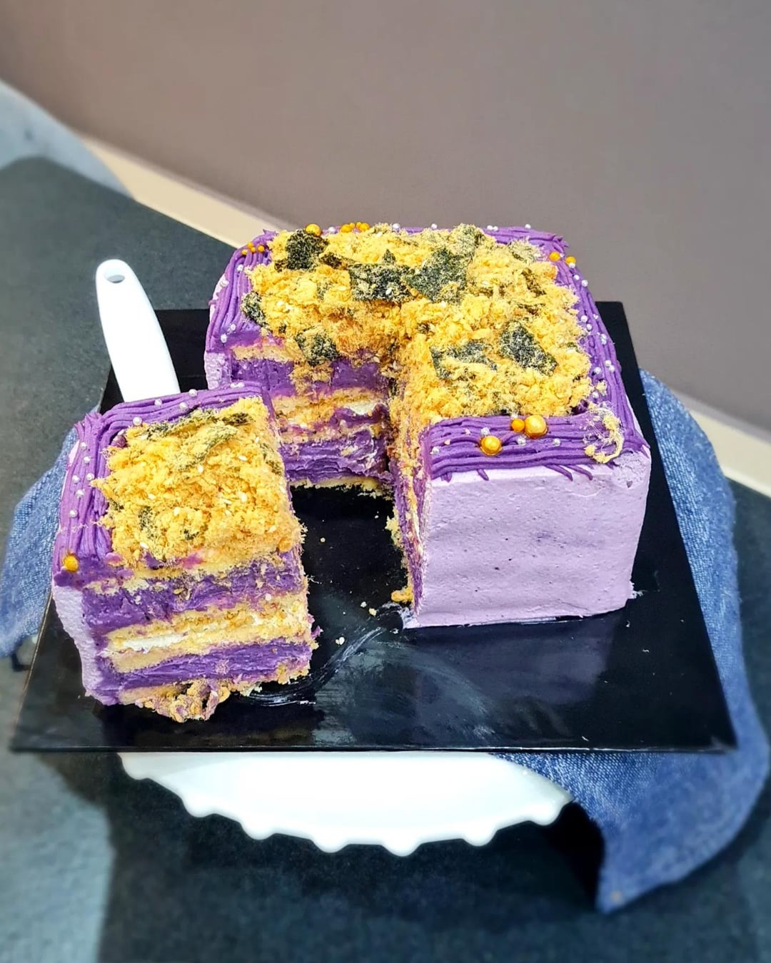 Made Yam/Taro blended with purple sweet potato for vibrant purple velvet frosting. Made Yam/Taro Chicken Floss cake using chiffon cake and whipped cream frosting for husband’s birthday, thanks God, he loves it so much.