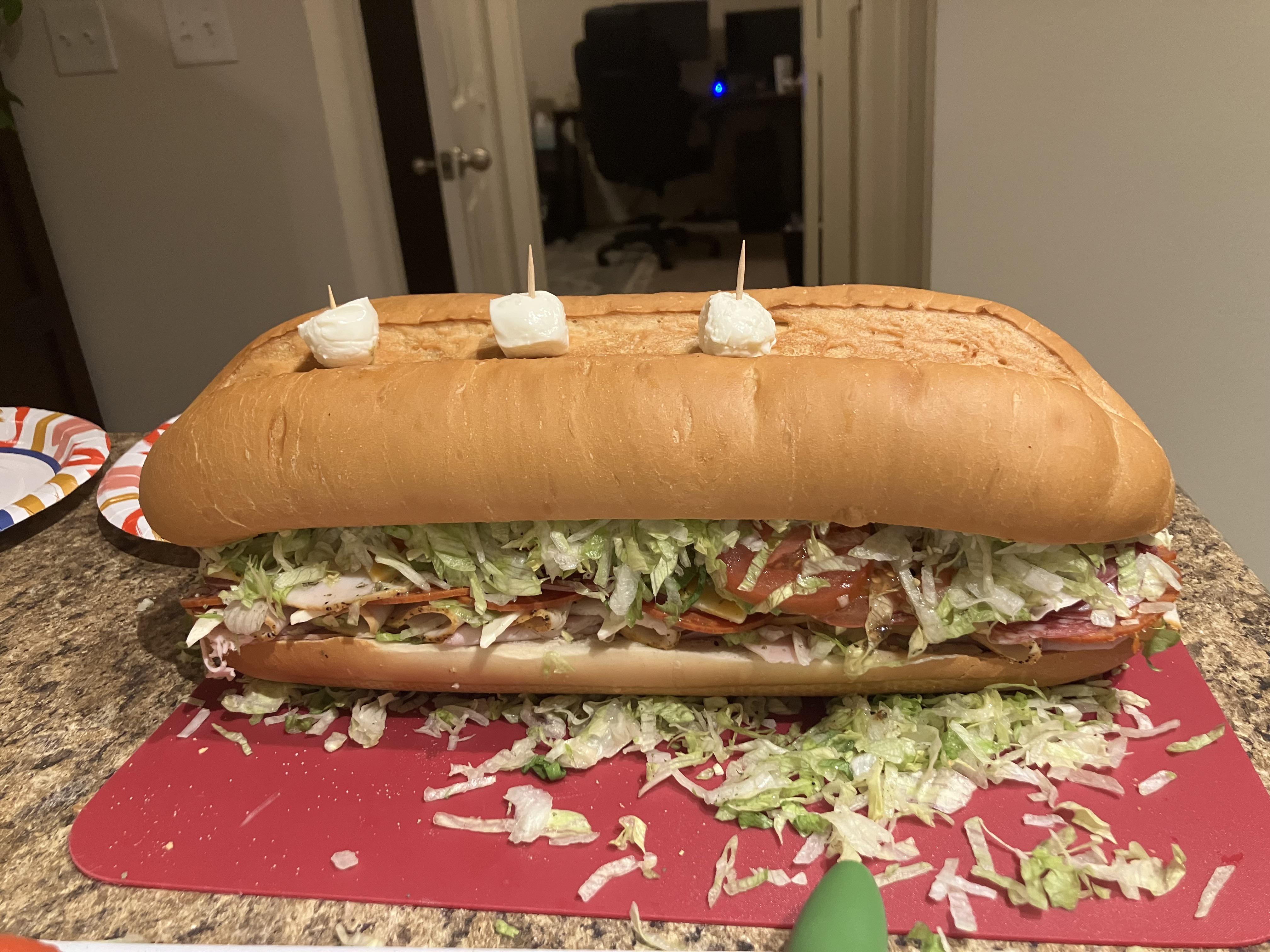 We have this pic rotating in our digital frame haha. Italian bread, with all sorts a meats- pepperoni, salami, Turkey, ham. Then colby Jack cheese, Lettuce, tomates, avocado. Sub dressing. (Add your own condiments)