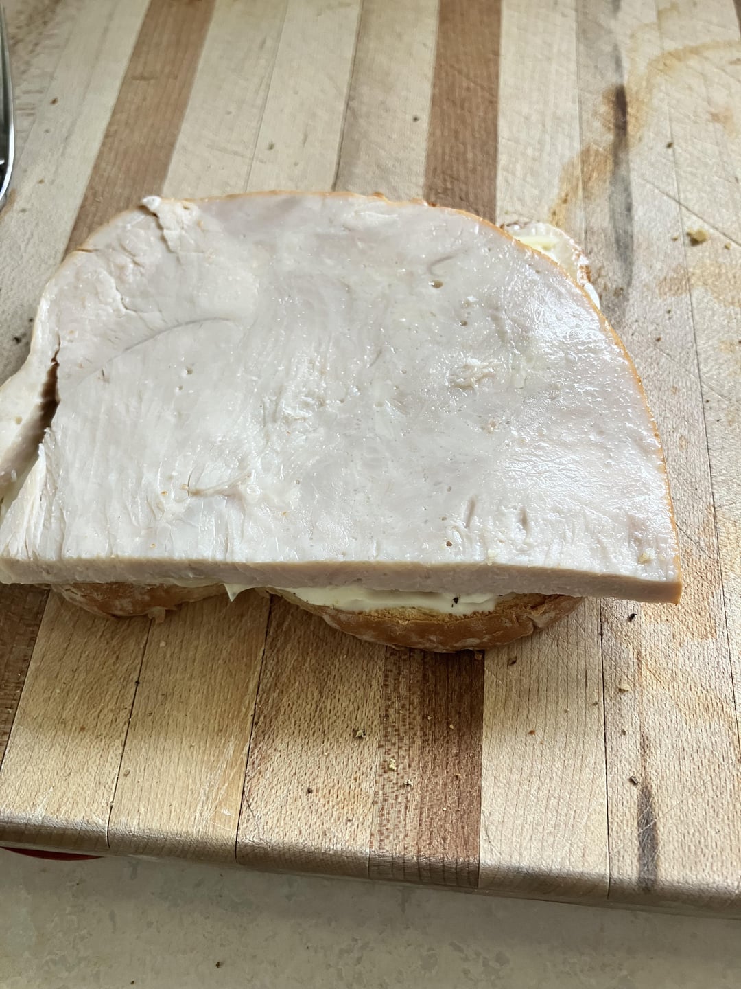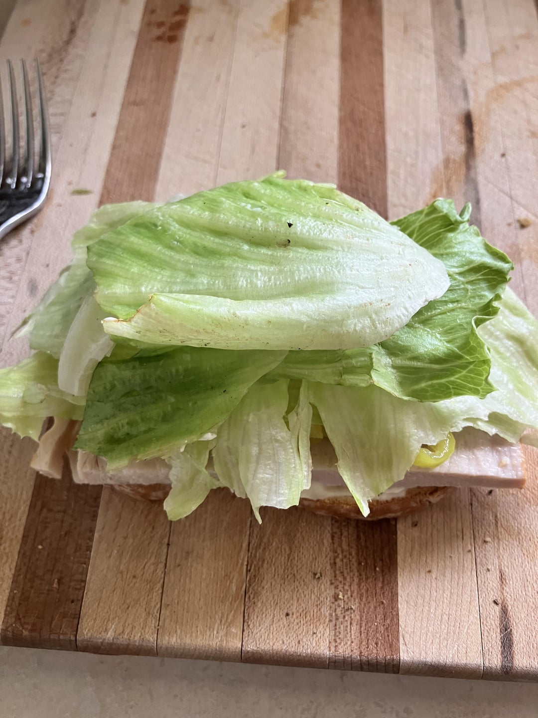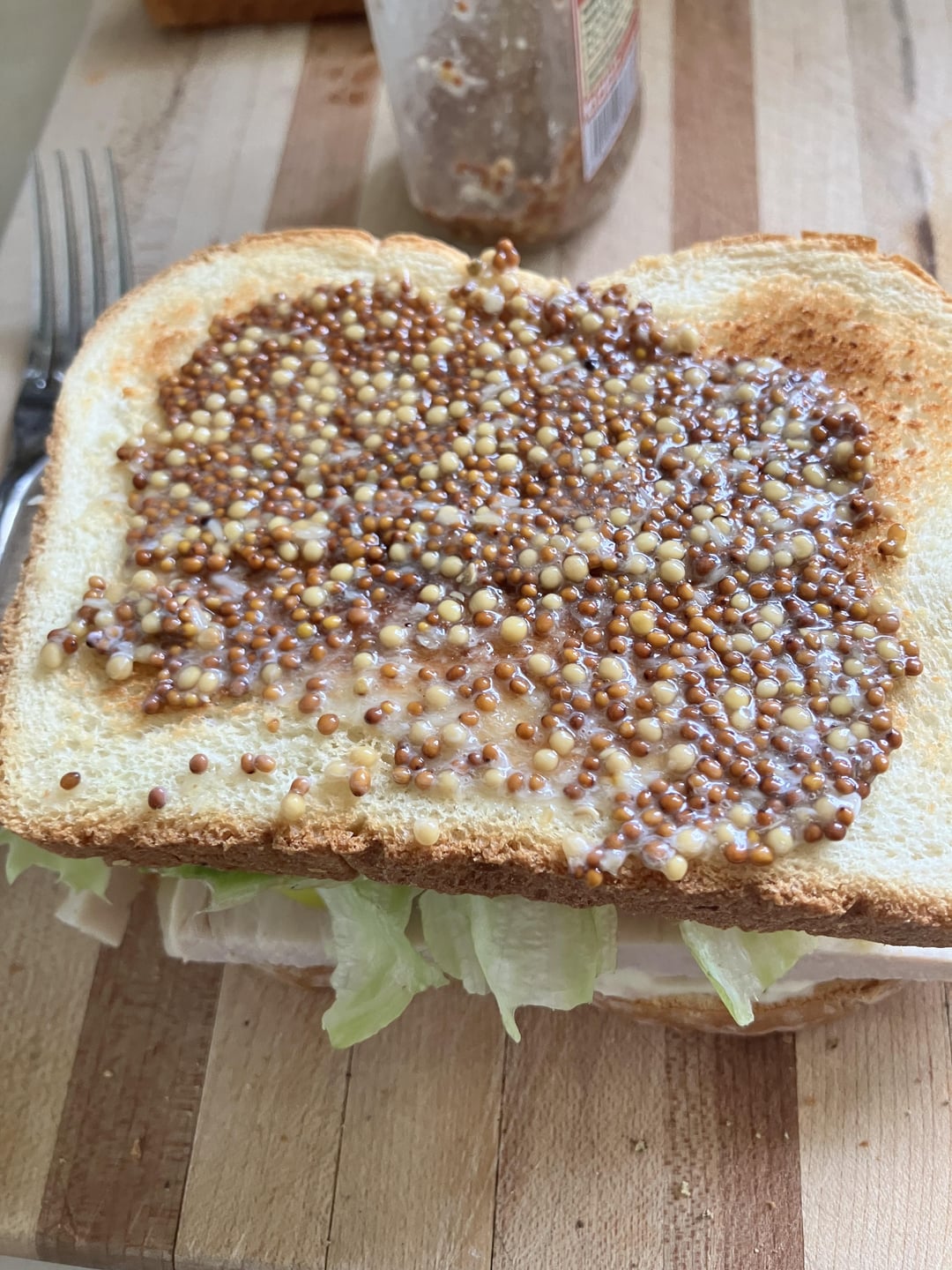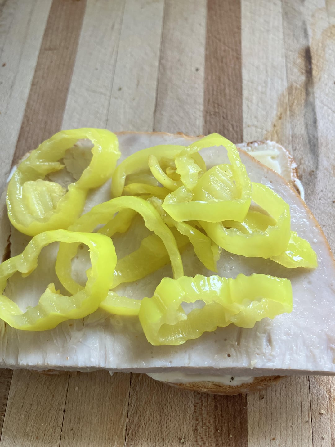 I like ‘em thicc, turkey club edition. Thick turkey, Swiss, lettuce, tomato, onion, bacon, banana peppers, mayo; whole grain mustard