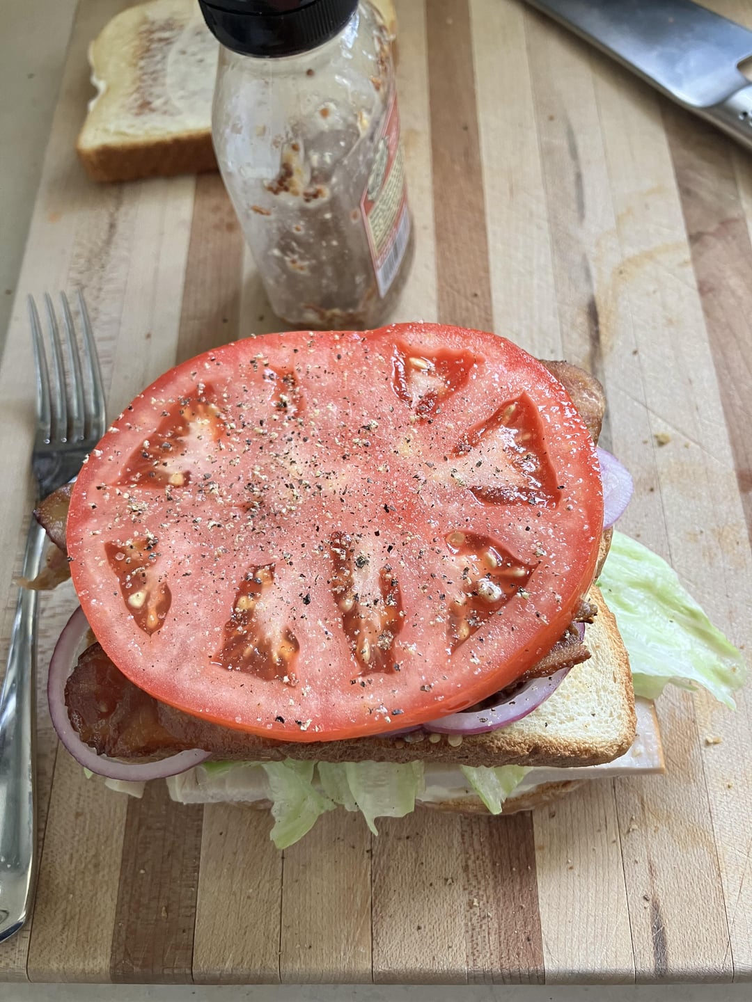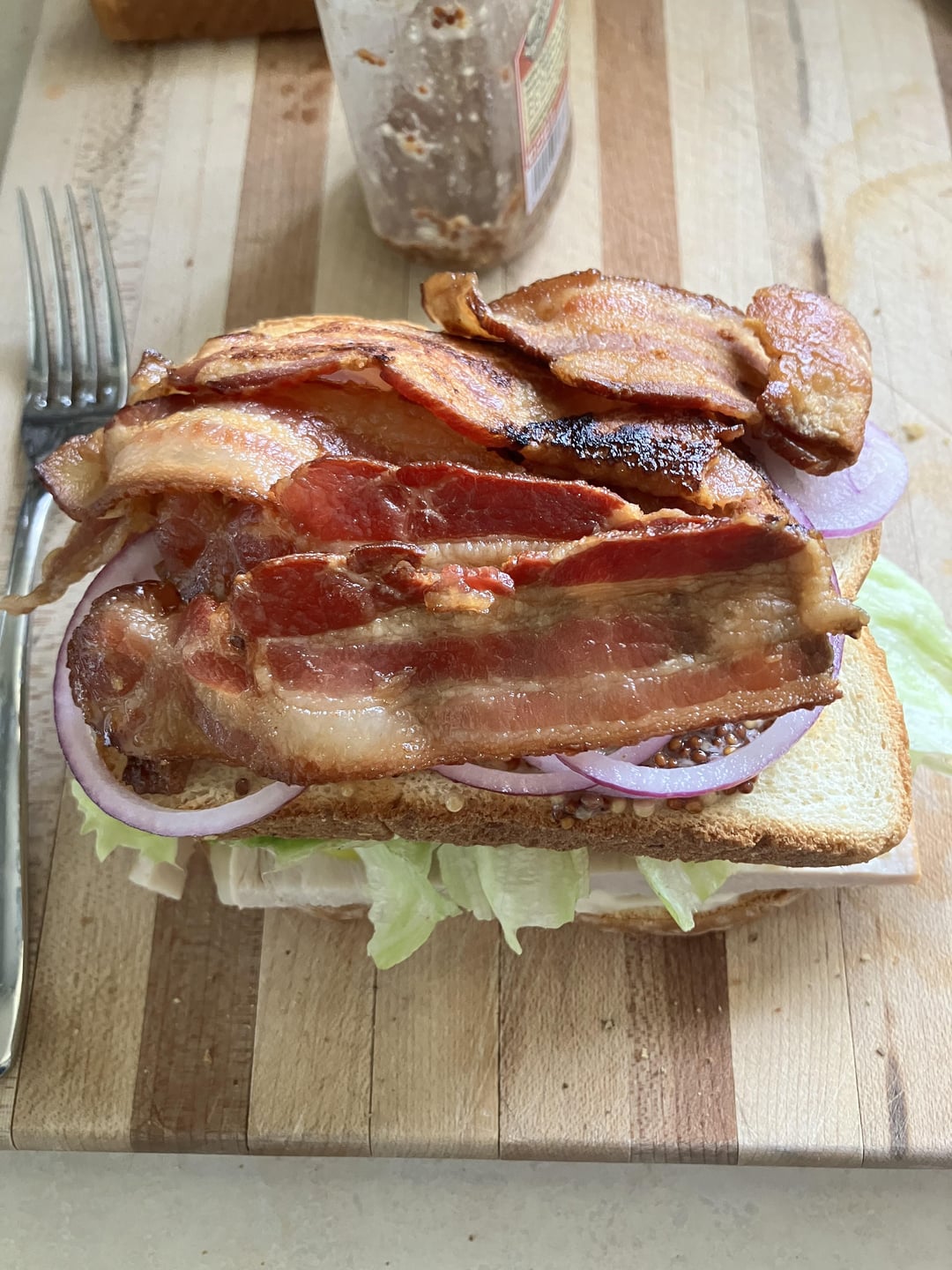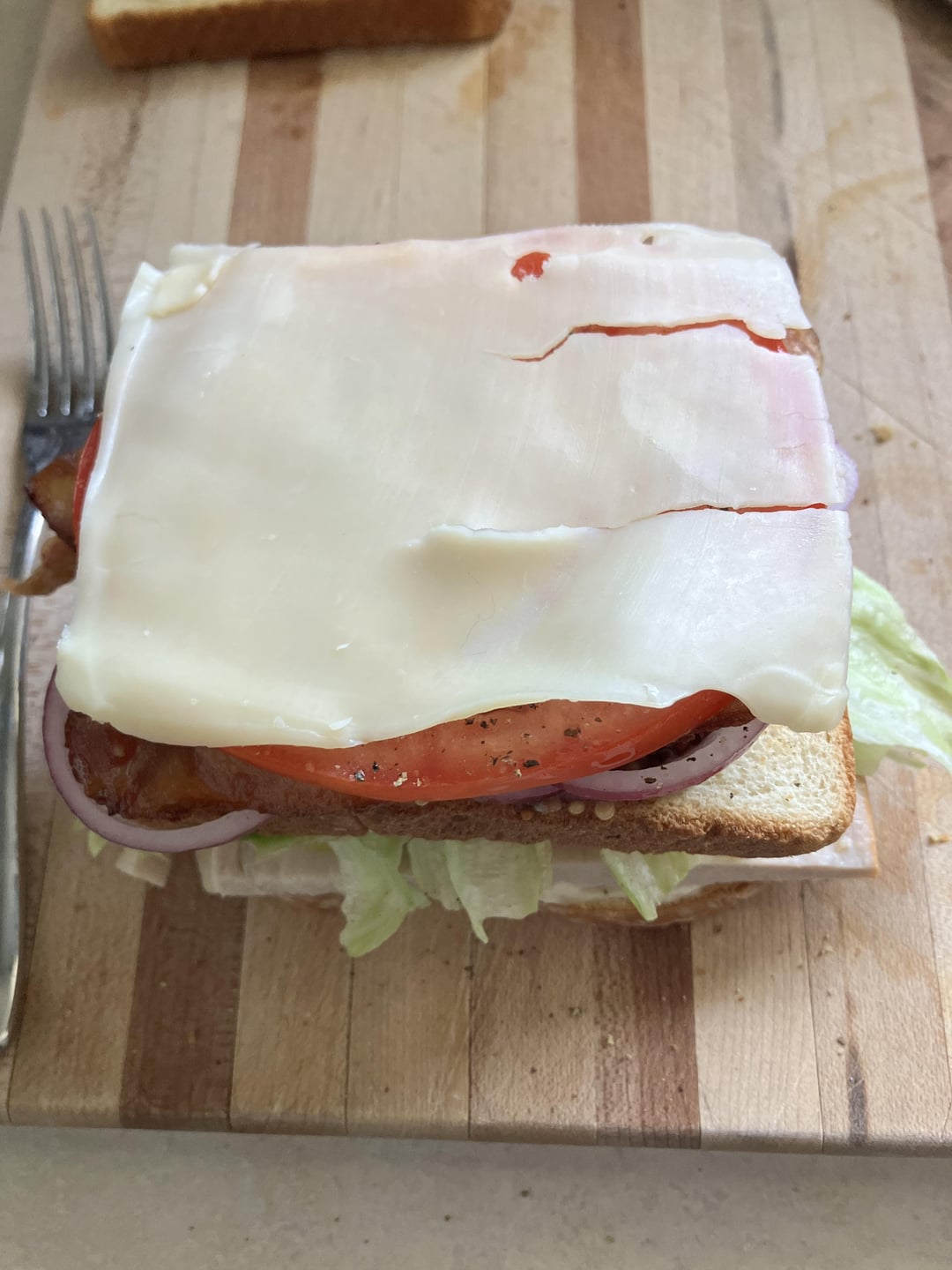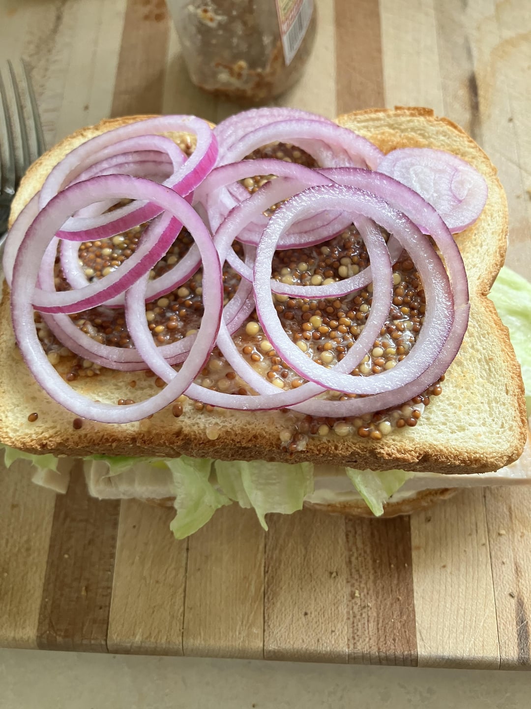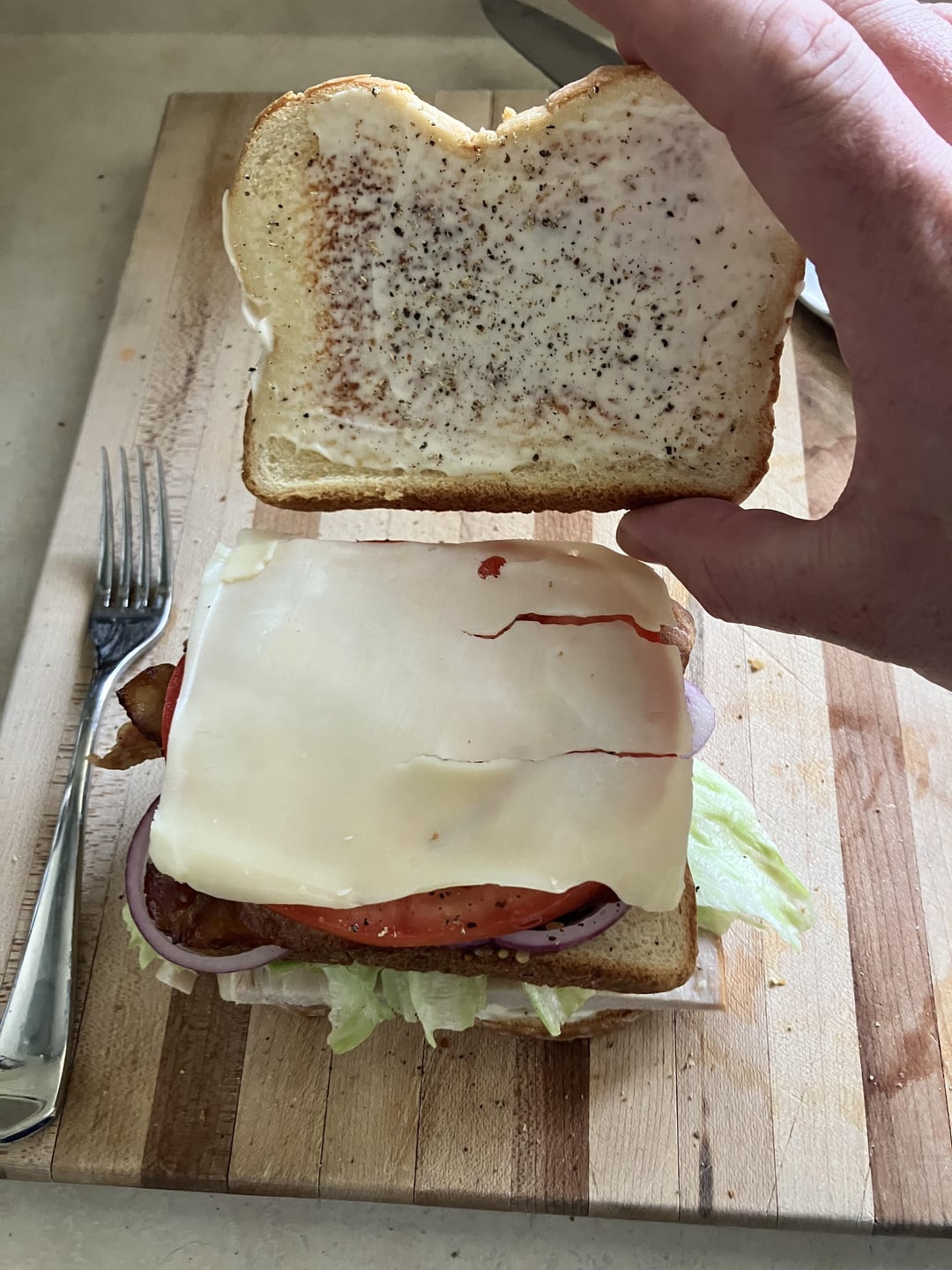 I like ‘em thicc, turkey club edition. Thick turkey, Swiss, lettuce, tomato, onion, bacon, banana peppers, mayo; whole grain mustard