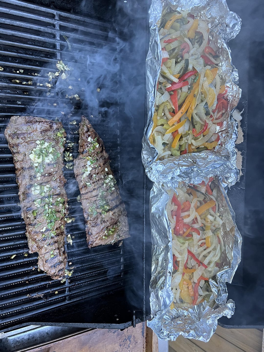 If you halved the peppers, and thick sliced the onions, think of how much more flavor they would have. Foil is simply a flavor barrier. Slice the peppers after getting a nice char.