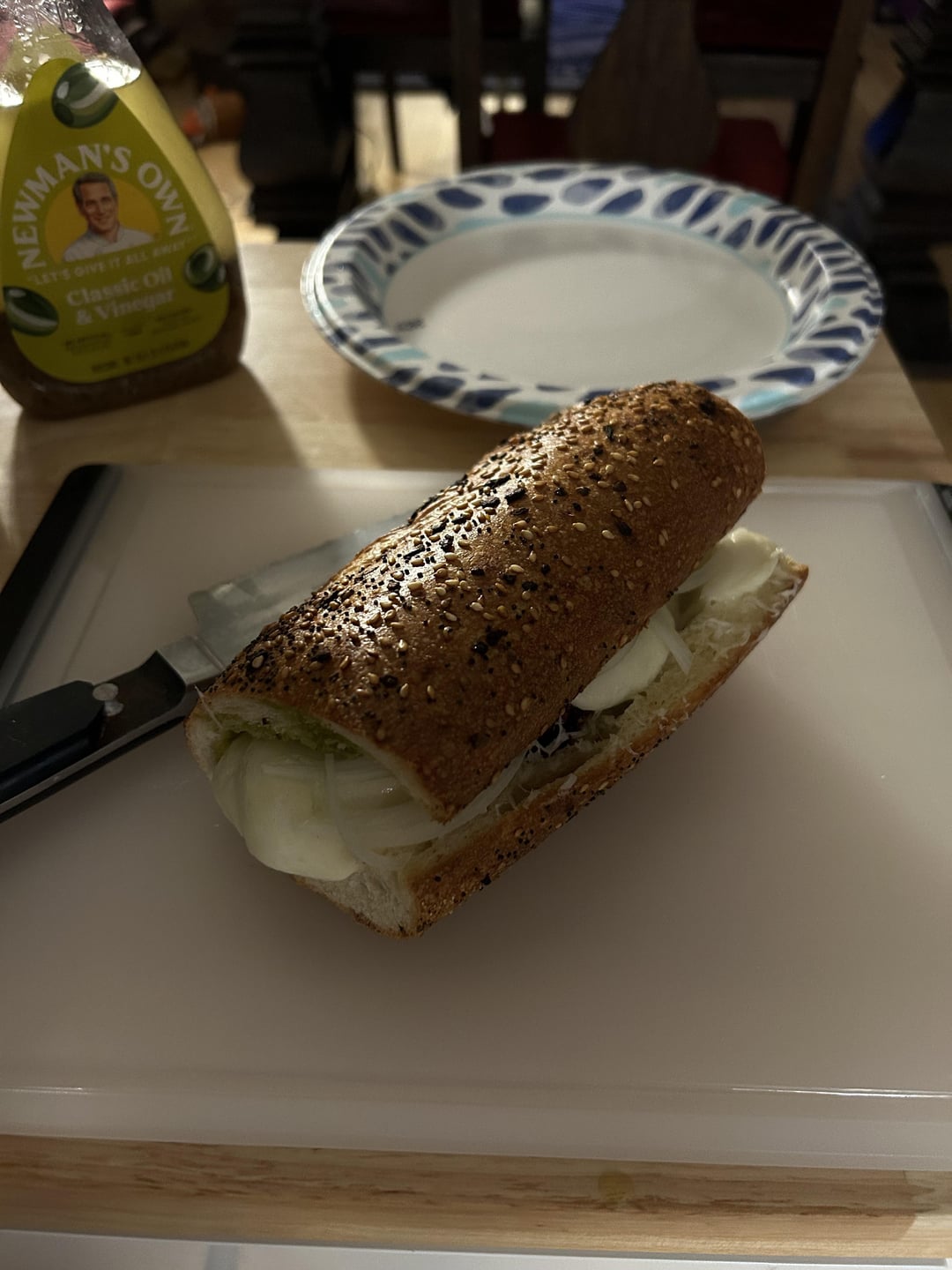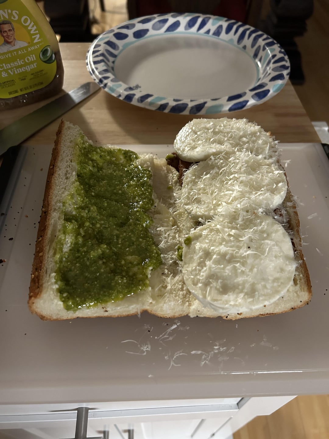 Chicken cutlet, mozz, parm, pesto, bacon, everything seasoning French bread.
