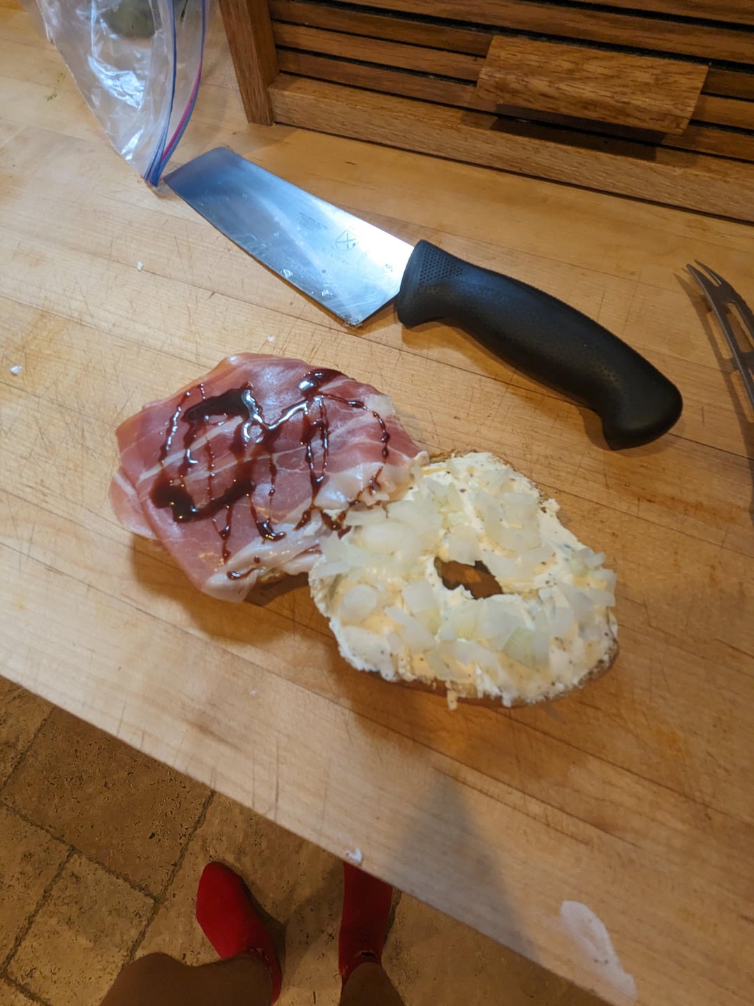 Homemade hatch chile bagel, prosciutto, garlic/mustard/black pepper cream cheese, onion, balsamic glaze. Cheers to baking!!