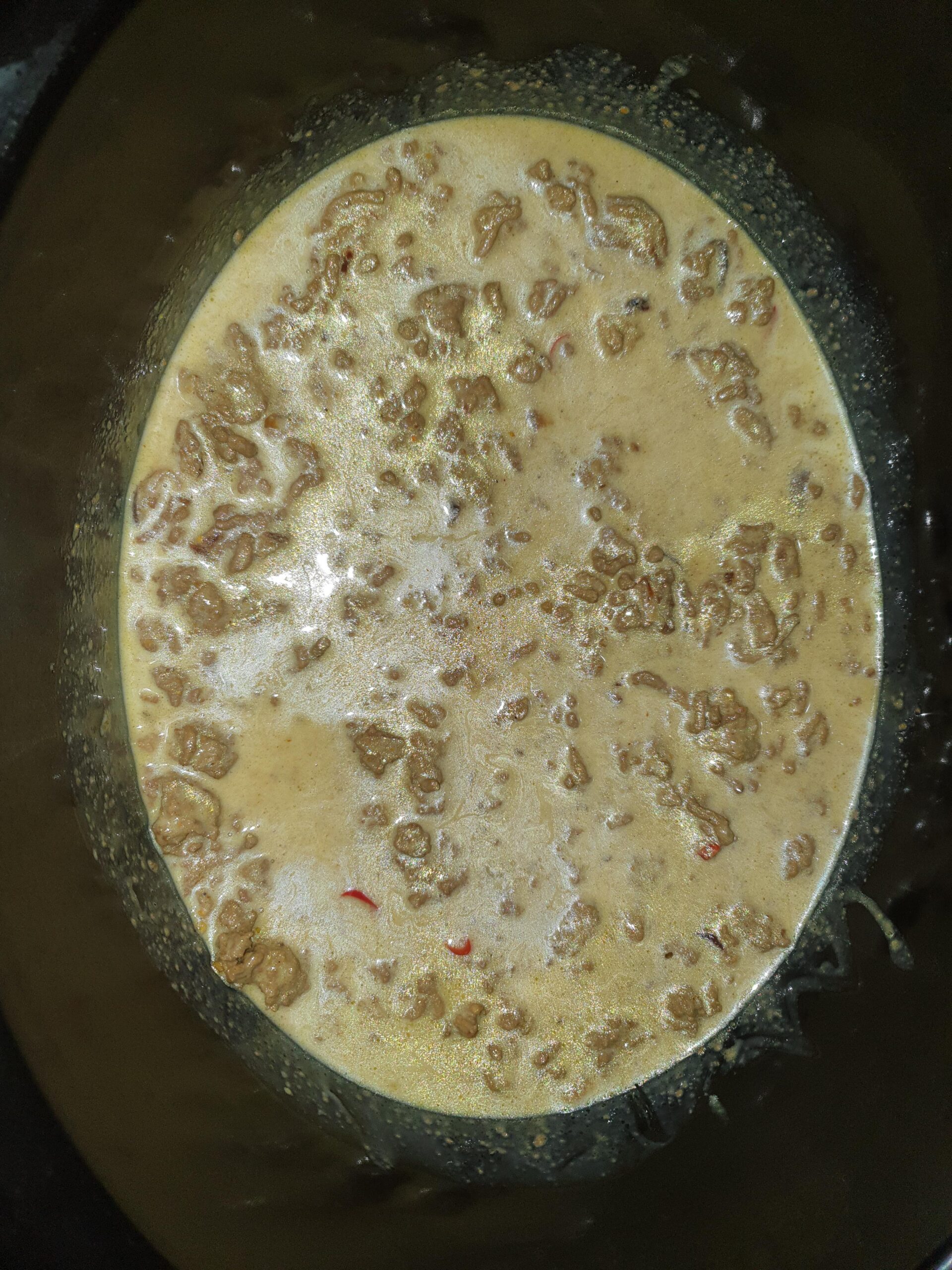 6. Pour the coconut cream over the lamb mince in the slow cooker. Stir to combine all the ingredients.