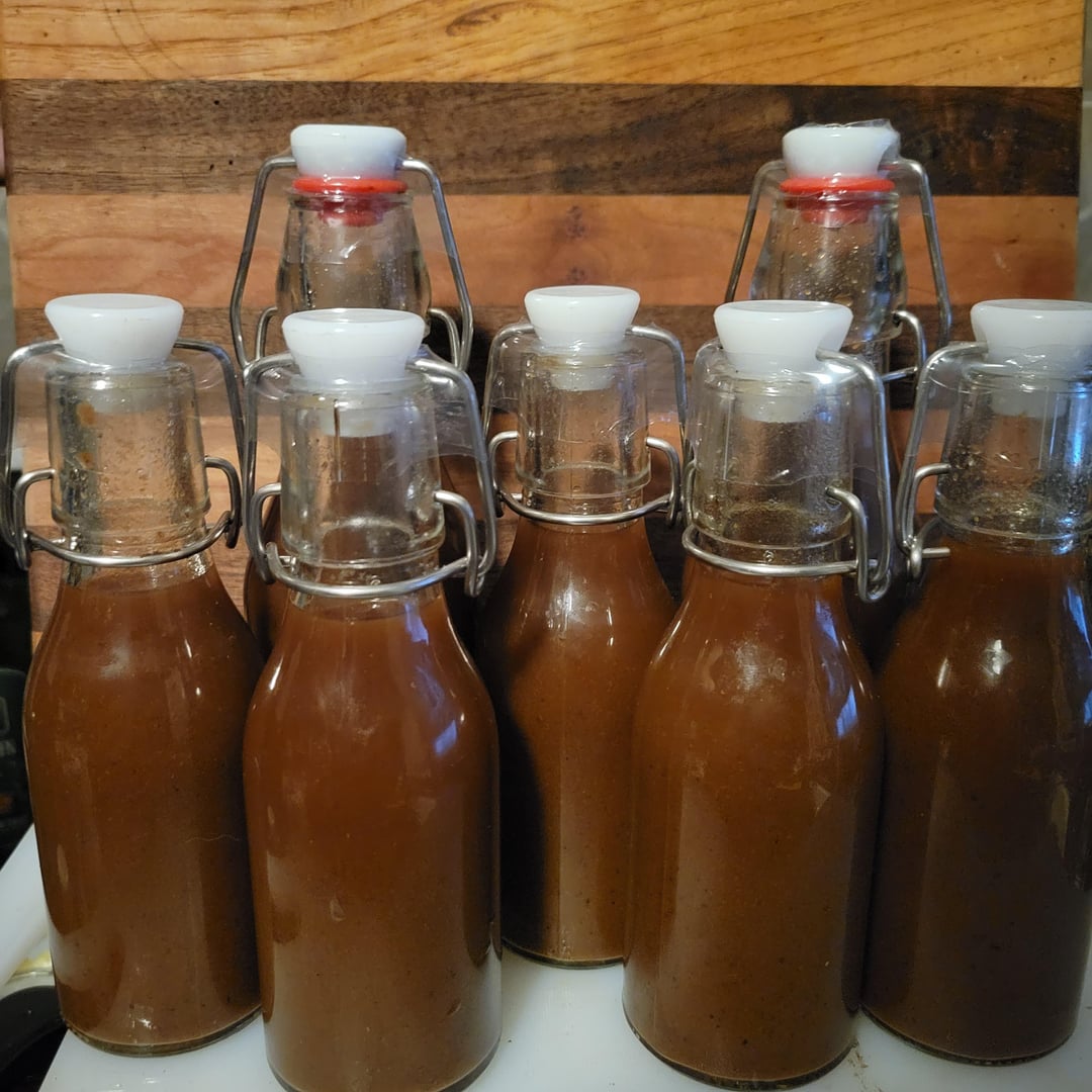 Smoked habanero, scotch bonnets (from my garden) and garlic. Coffee infused balsamic and cold brew coffee. Smoky, sweet, chocolatey, and a nice slow long lasting burn.by Troublemakerjake Write A CommentYou must be logged in to post a comment.
