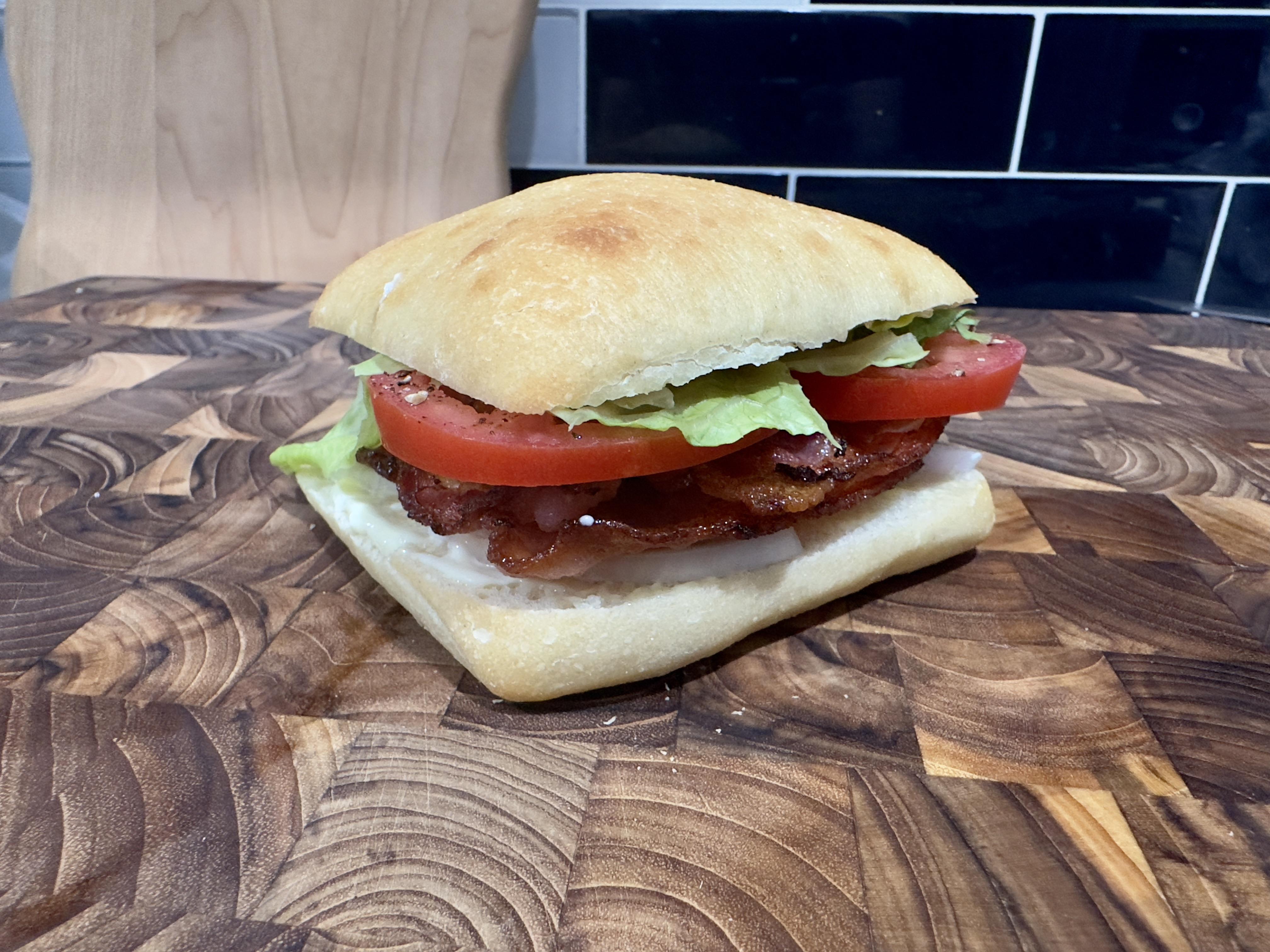 BLT w/ onion and mayo on a warmed ciabatta tomatoes were salted and peppered.by icutfarts Write A CommentYou must be logged in to post a comment.