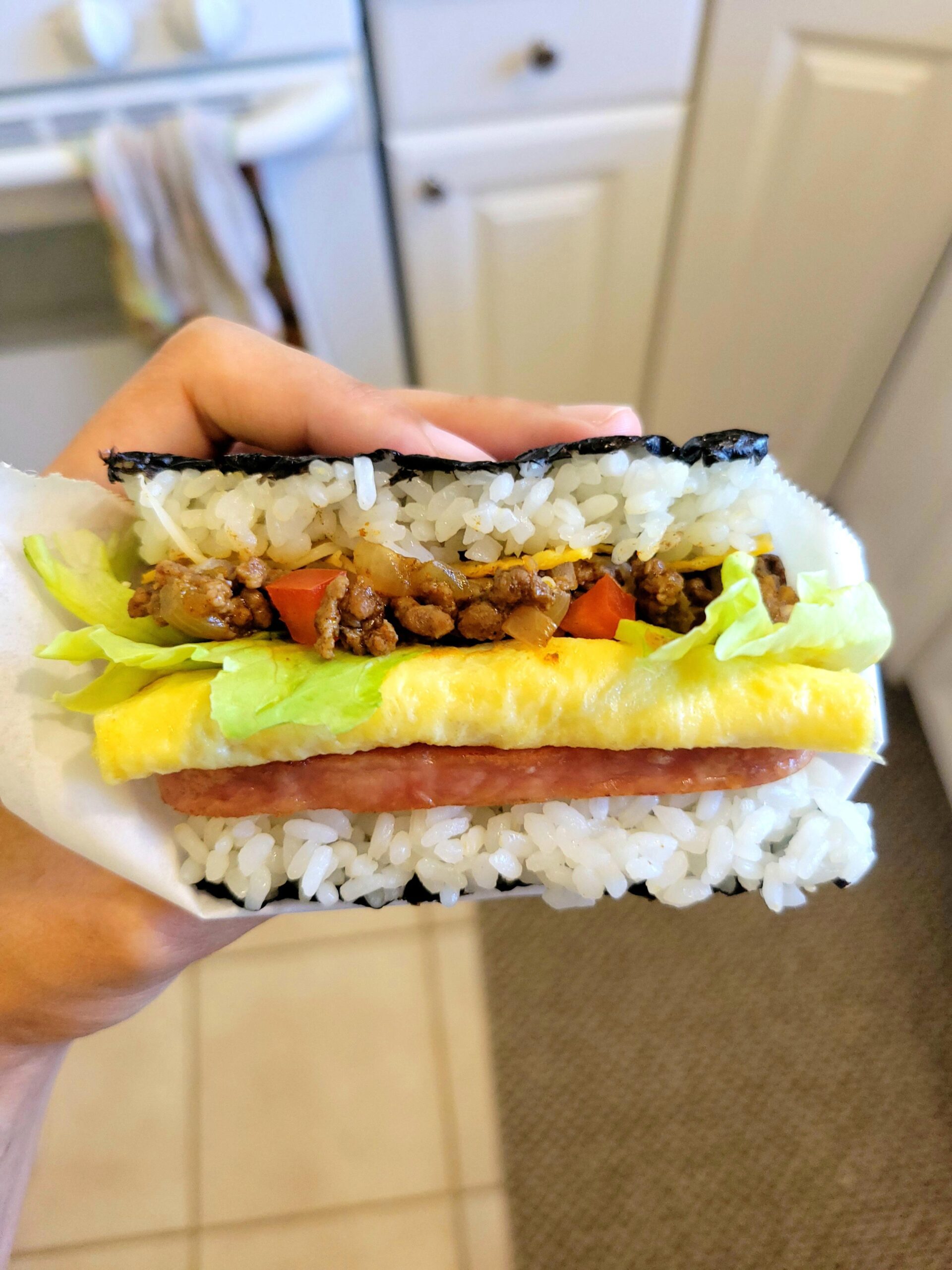 This is a copycat rice “sandwich” from a restaurant called “Potama” which is famous for its pork tamago onigiri, and they have a taco rice option on their menu that I had to try recreating. You start with 1/2 a sheet of nori, add some rice, then fried spam, tamago (rolled japanese omelette), lettuce, taco seasoned ground beef, diced tomatoes, red onions, shredded cheese, and little pieces of tortilla chips.
