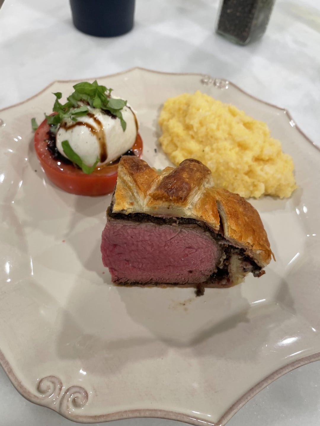 So proud of her. Beefsteak tomato and burrata, polenta, and beef Wellington.