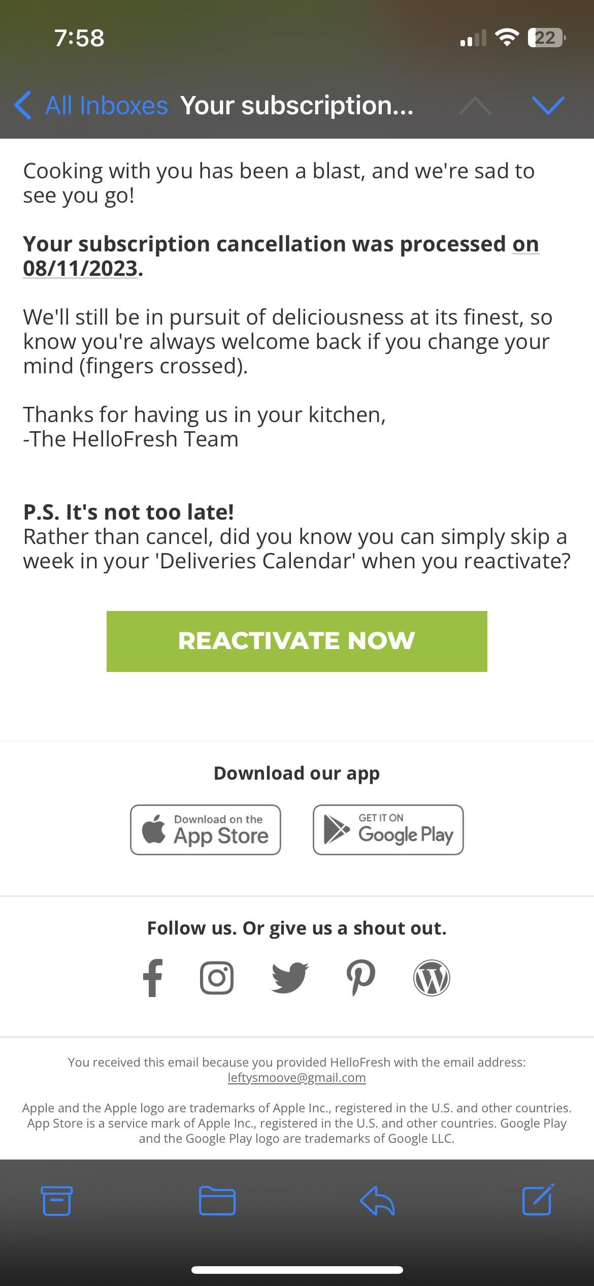 I canceled today why does it say the 11th?by restoringconfidence 2 Comments mdmenzel 3 years ago Probably it is the middle of your current delivery window. Junior_Tradition7958 3 years ago If you didn’t skip the next week prior to cancelling you may receive one last box.Write A CommentYou must be logged in to post a comment.