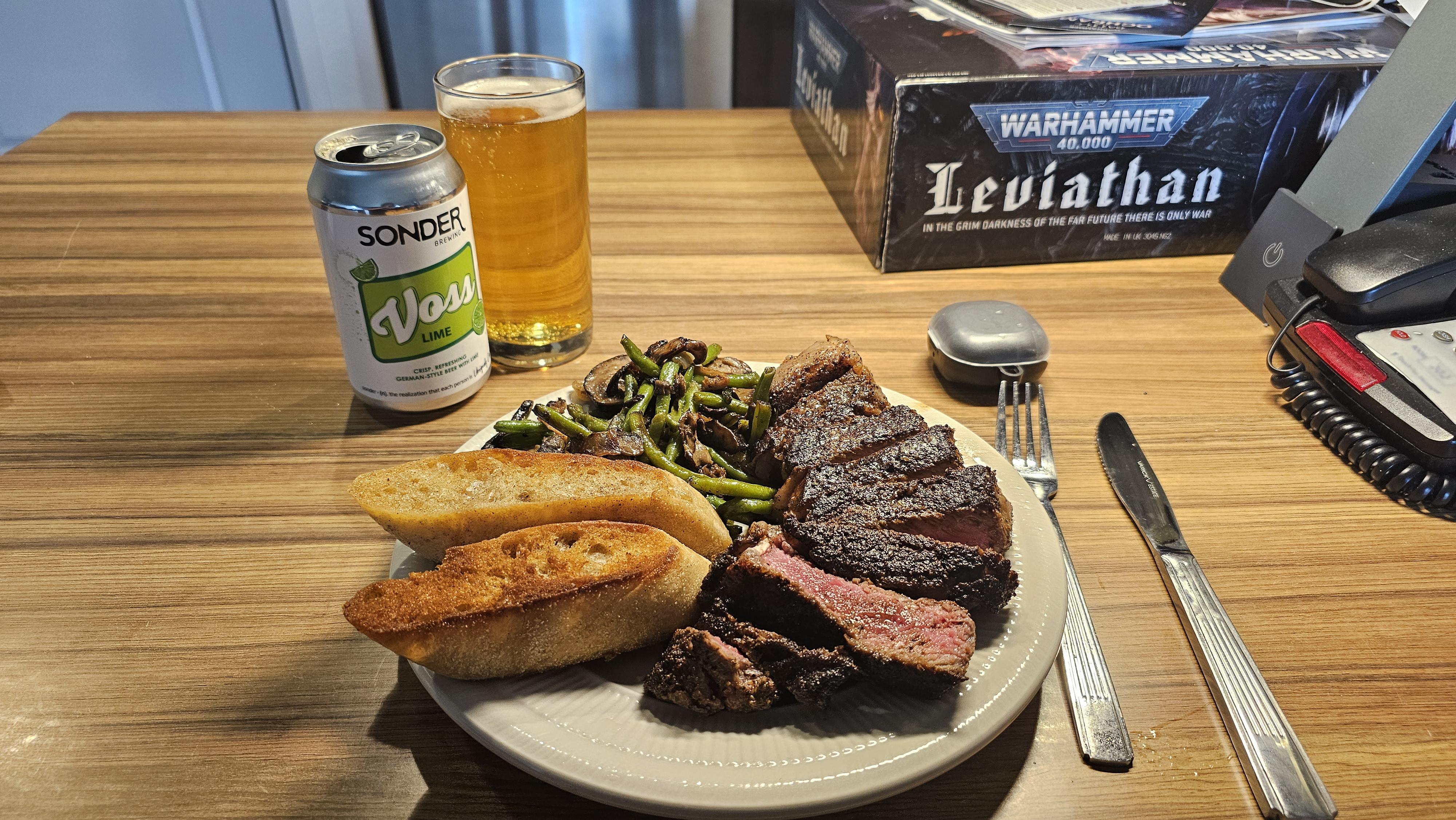 A nice ny strip with toast and what looks like pan seared green beans with mushrooms, paired with a nice beer and a box of minis, sounds like an awesome night