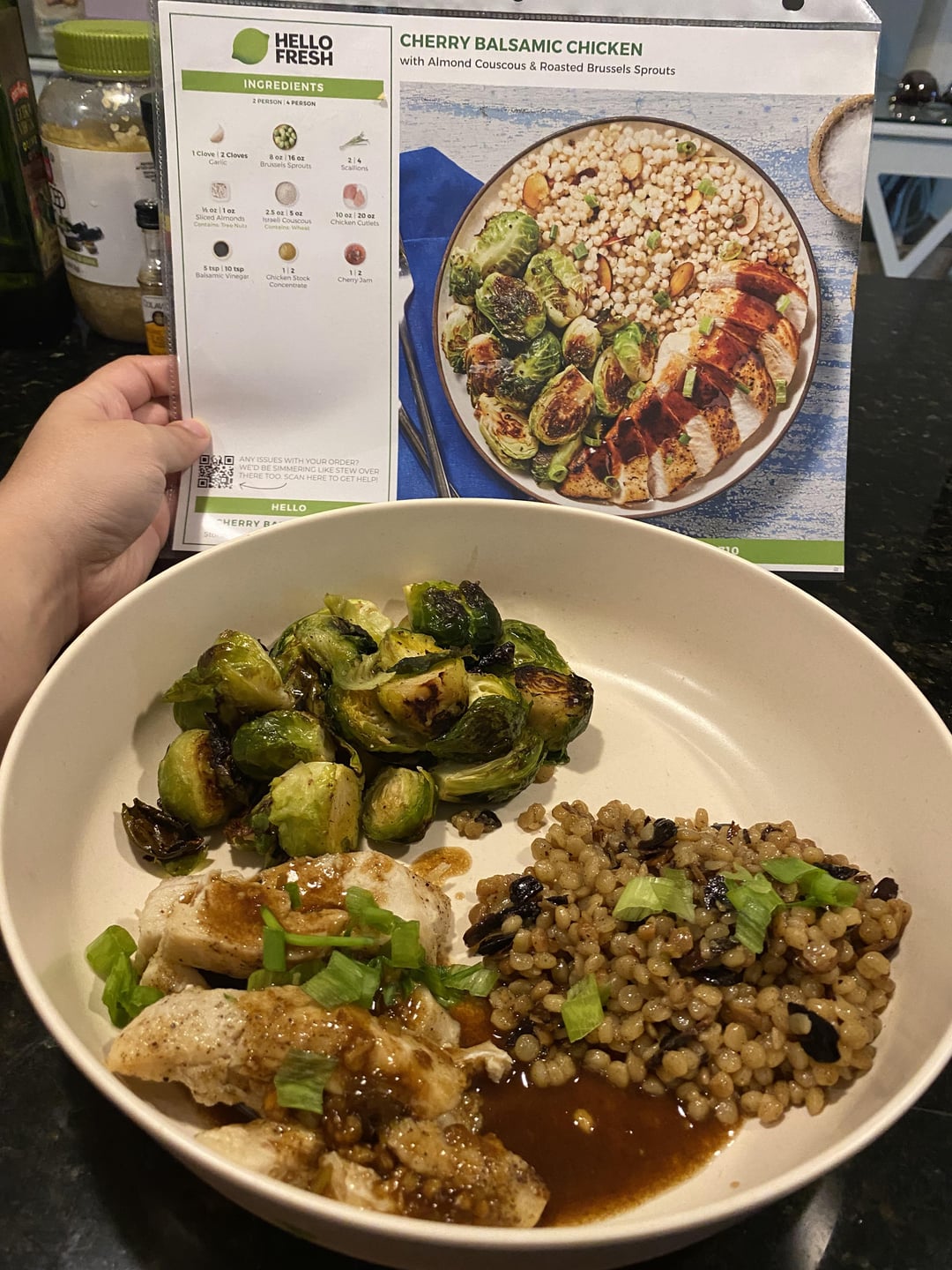 The flavors of this dish were not hitting for me at all. The balsamic sauce was nothing special and I realize I don’t like the texture of Israeli Couscous. The brussel sprouts were huge and delicious, the chicken was juicy and well cooked, and that’s about all I can say for this dish. I didn’t even finish my plate 🙁