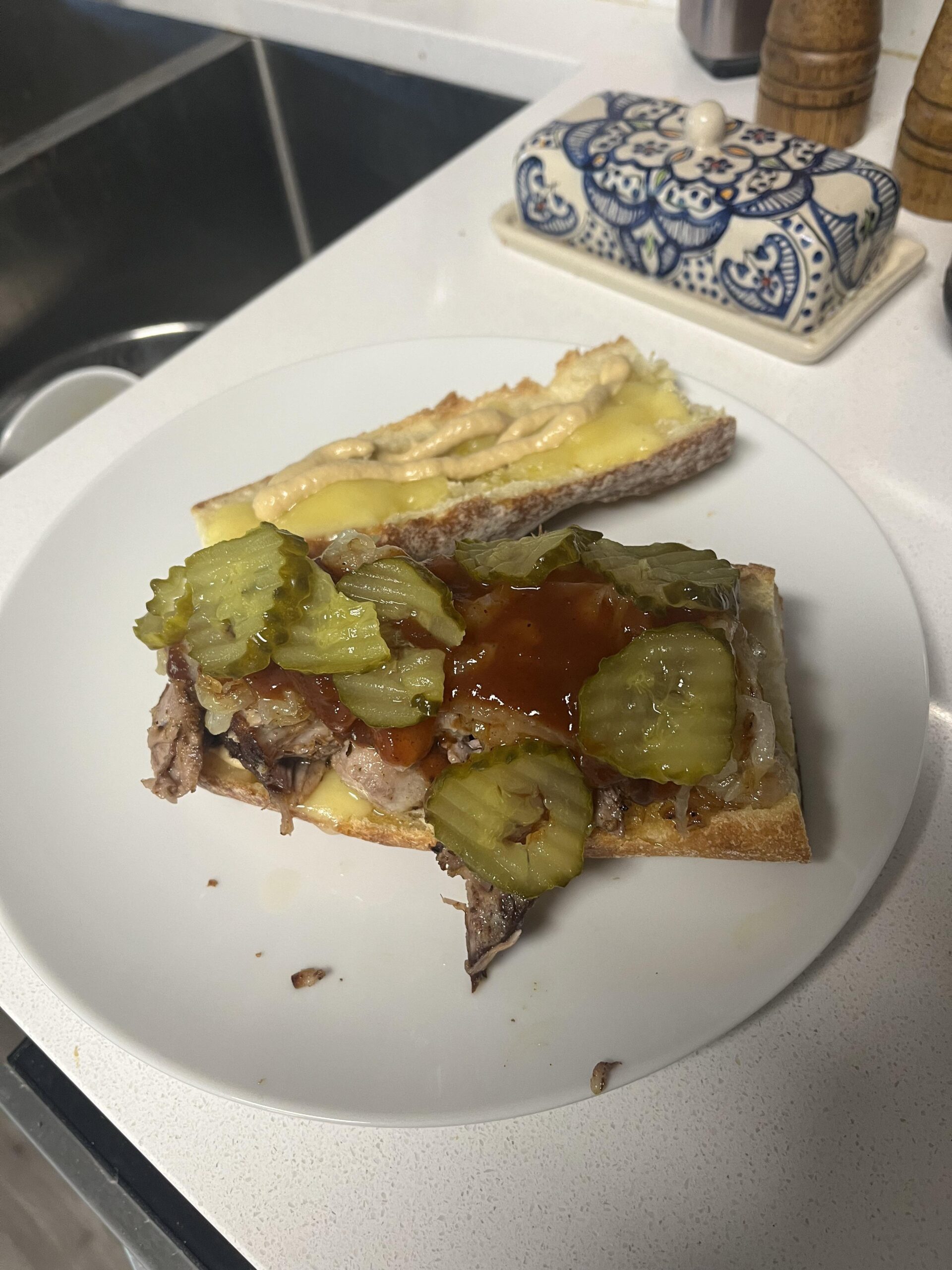 Gouda melted onto baguette under broiler, pulled pork, slowly caramelized onions, and pickles with Dijon and bbq sauce (Grey Poupon & Stubbs, respectively)by Hey1243 Write A CommentYou must be logged in to post a comment.