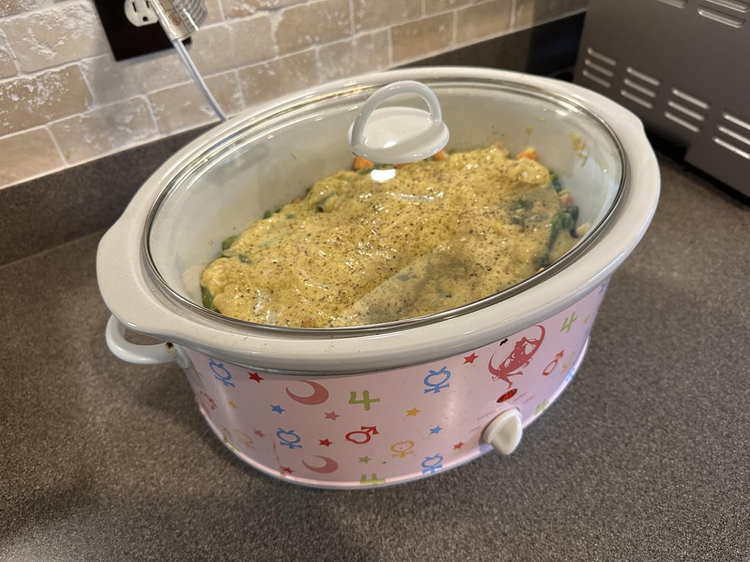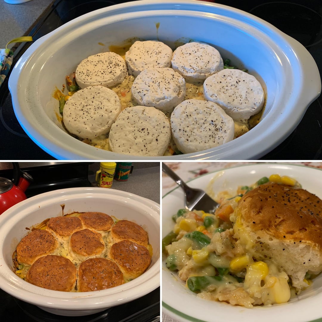 Add the biscuits on top of the mixture once the 3-hour cook time is complete.