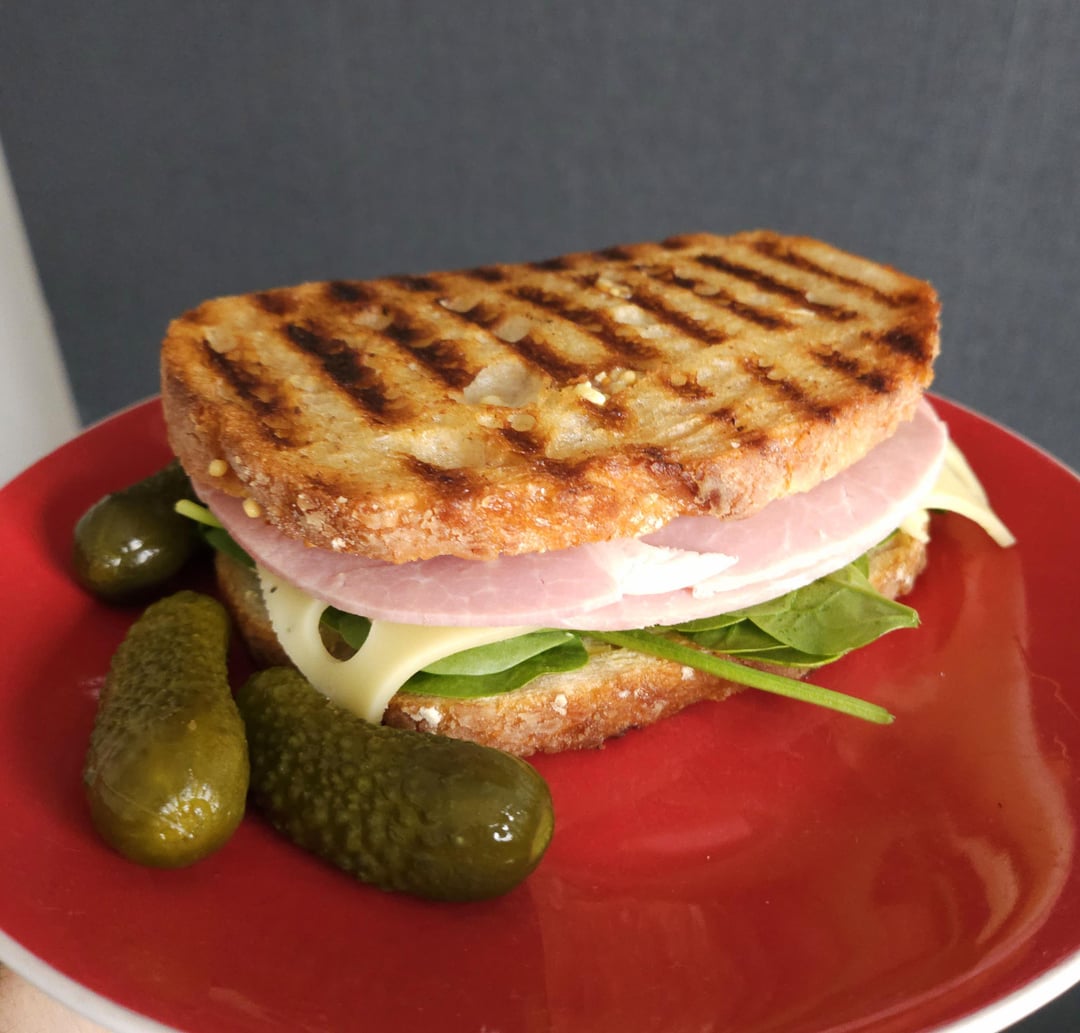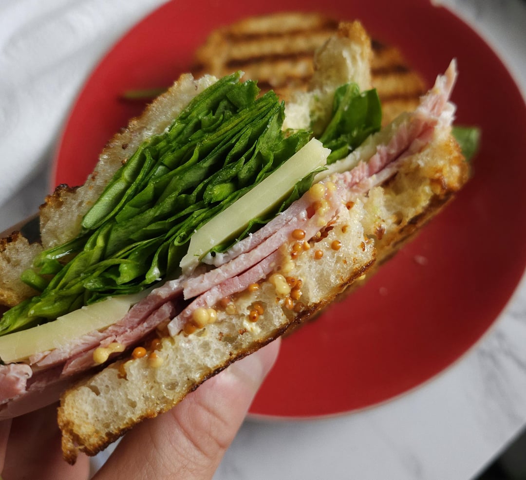 Applewood smoked ham, jarlsberg, whole grain mustard, spinach, on toasted sourdough.